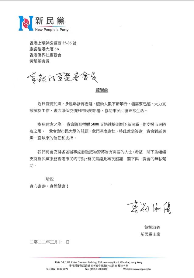 新民黨主席葉劉淑儀表示,當前香港第五波新冠疫情防控形勢嚴峻,香港各界都在齊心合力抗擊疫情。新民黨將全力配合做好香港抗疫工作,同时對香港僑界社團聯會的捐贈表示了衷心的感謝。王錦彪及廖宇軒常務副會長向葉劉主席介紹了近期香港僑界社團聯會組織義工支援社區抗疫工作的情況。