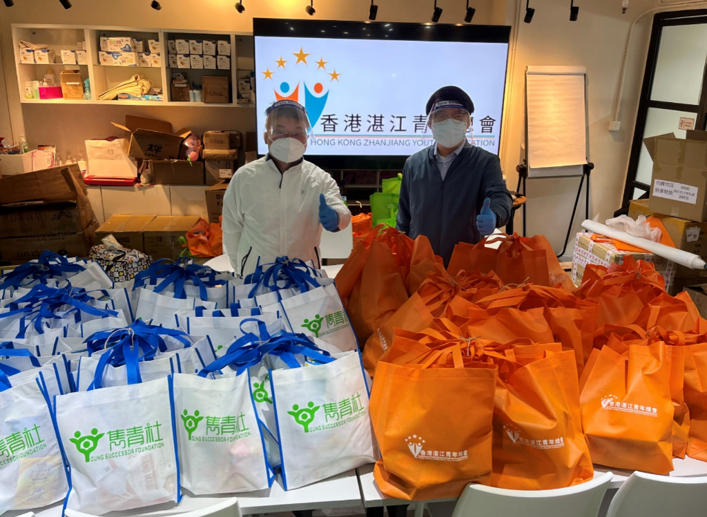 近期香港疫情嚴峻,2月26日新增高達1.7萬余宗,由於醫院病床飽和,醫護告急,大量無法入院被迫留在家中的染疫市民物資短缺,部分基層家庭也面臨物資採購困難。面對時艱,香港湛江青年總會、雋青社等同鄉社團青年組織合辦了“風雨同路 同心抗疫”抗疫物資派贈活動,向三百個基層家庭及染疫留家的市民派贈抗疫福袋,每個福袋包含抗疫物資(快速檢測盒、酒精搓手液、口罩、板藍根等),也有食物(方便麵、餅乾、午餐肉、奶茶等),希望可以緩解這部分市民的燃眉之急。