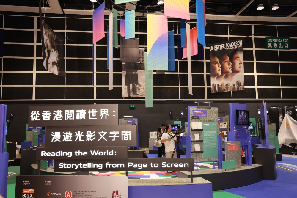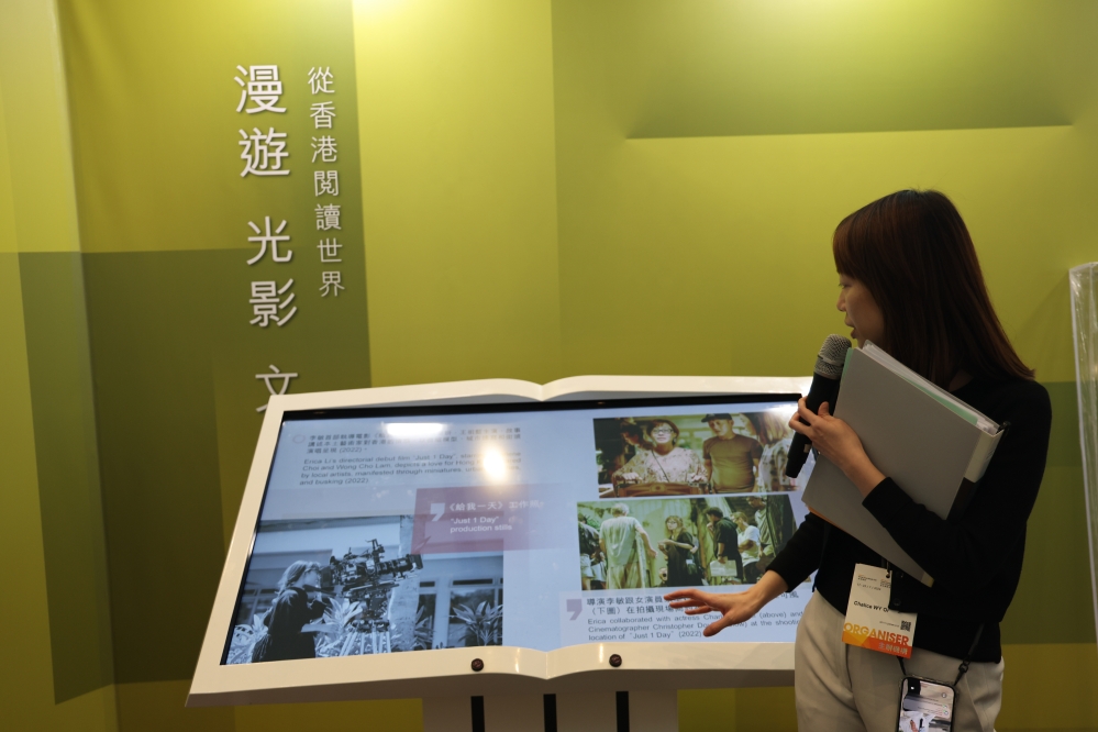 “文藝廊”則細分為三大展區:“年度主題推介作家”展區匯聚了李敏、杜國威、陳韻文等傑出作家的著作、手稿及珍貴電影道具;“焦點導演”展區則集中展示王家衛、徐克、許鞍華等名導的精選作品;而“經典改編影視作品”展區,則通過原著小說、改編電影短片、海報、電子書及主題曲等多元形式,帶領觀眾重溫亦舒、金庸等文學大師的經典之作,並設有互動遊戲,讓參與者以武俠、京劇、科幻、民國為主題,拍攝專屬照片,體驗AI生成的個性化書本封面。