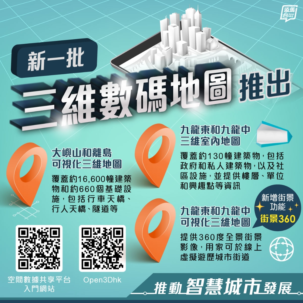 為推動智慧城市發展,地政總署正陸續開發並發布不同地區的三維數碼地圖。最新推出的大嶼山和離島可視化三維地圖、九龍東和九龍中三維室內地圖,以及於早前發布的九龍東和九龍中可視化三維地圖新增的街景功能「街景360」,已於線上應用平台「Open3Dhk」發布。看圖了解詳情。