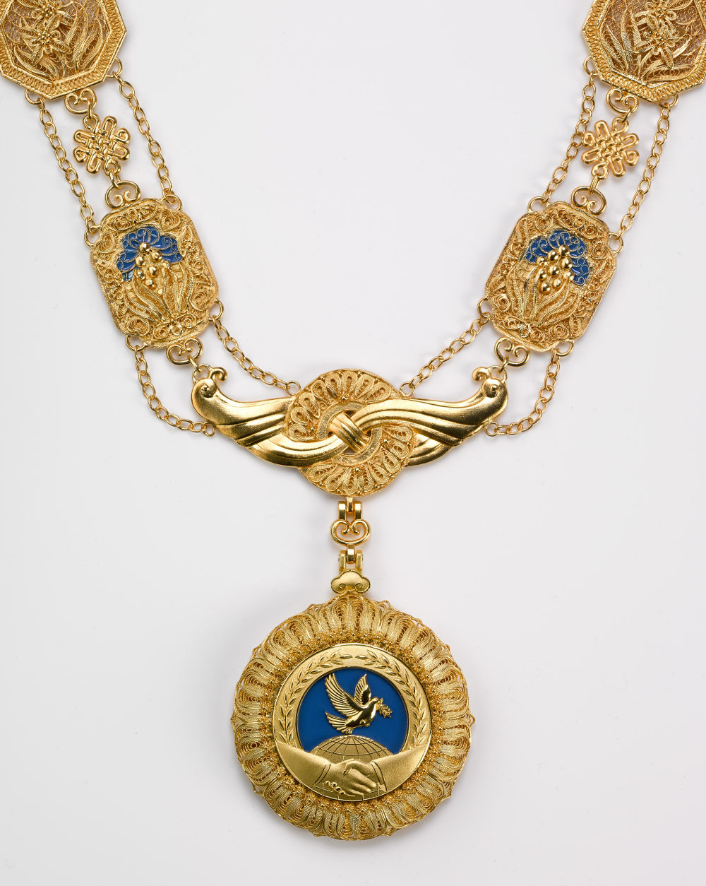 “友誼勳章”章體以金色、藍色為主色調,採用和平鴿、地球、握手、荷花等元素,章鏈採用中國結、萬年青、牡丹花、玉璧、蘭草等元素,整體採用花絲鑲嵌、掐絲琺琅等傳統工藝手工製作。設計製作象徵中國人民同各國人民友好團結、友誼長存,祝願世界各國共同繁榮發展。