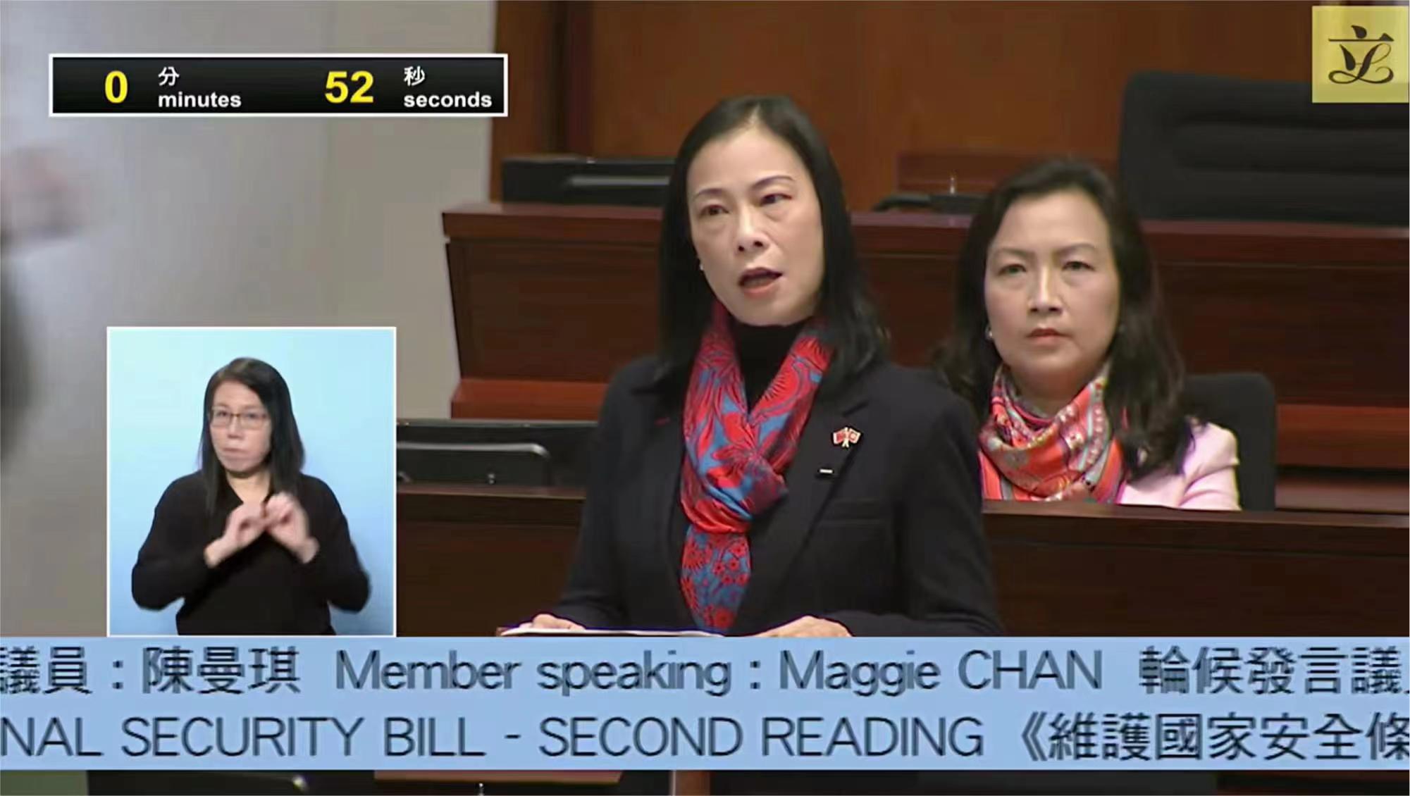 陳曼琪欣賞《條例草案》的弁言和第2條的文字清晰無誤、字字鏗鏘的陳述了《條例草案》的目的、基本理念及原則、香港特區憲制秩序和香港維護國家安全的憲制責任,並以法律形式指明了維護國家安全基本法第23條本地立法的必要性及緊急性。