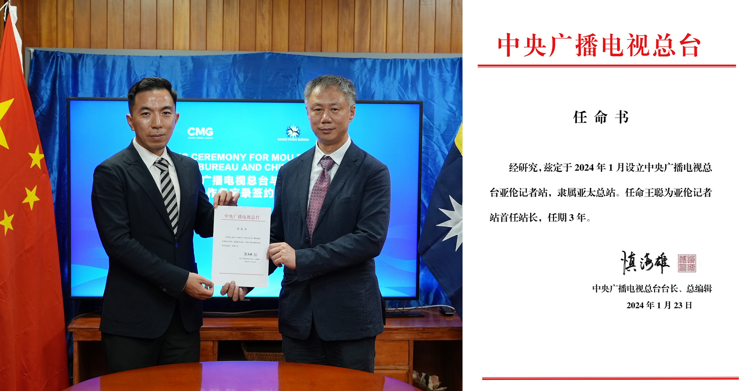 總台與瑙魯唯一的政府媒體機構——瑙魯媒體部簽署合作交流備忘錄,這是中瑙兩國復交以來在媒體領域簽署的首份合作協議。雙方將就合作機制、節目交換、人員交流等方面展開合作。
