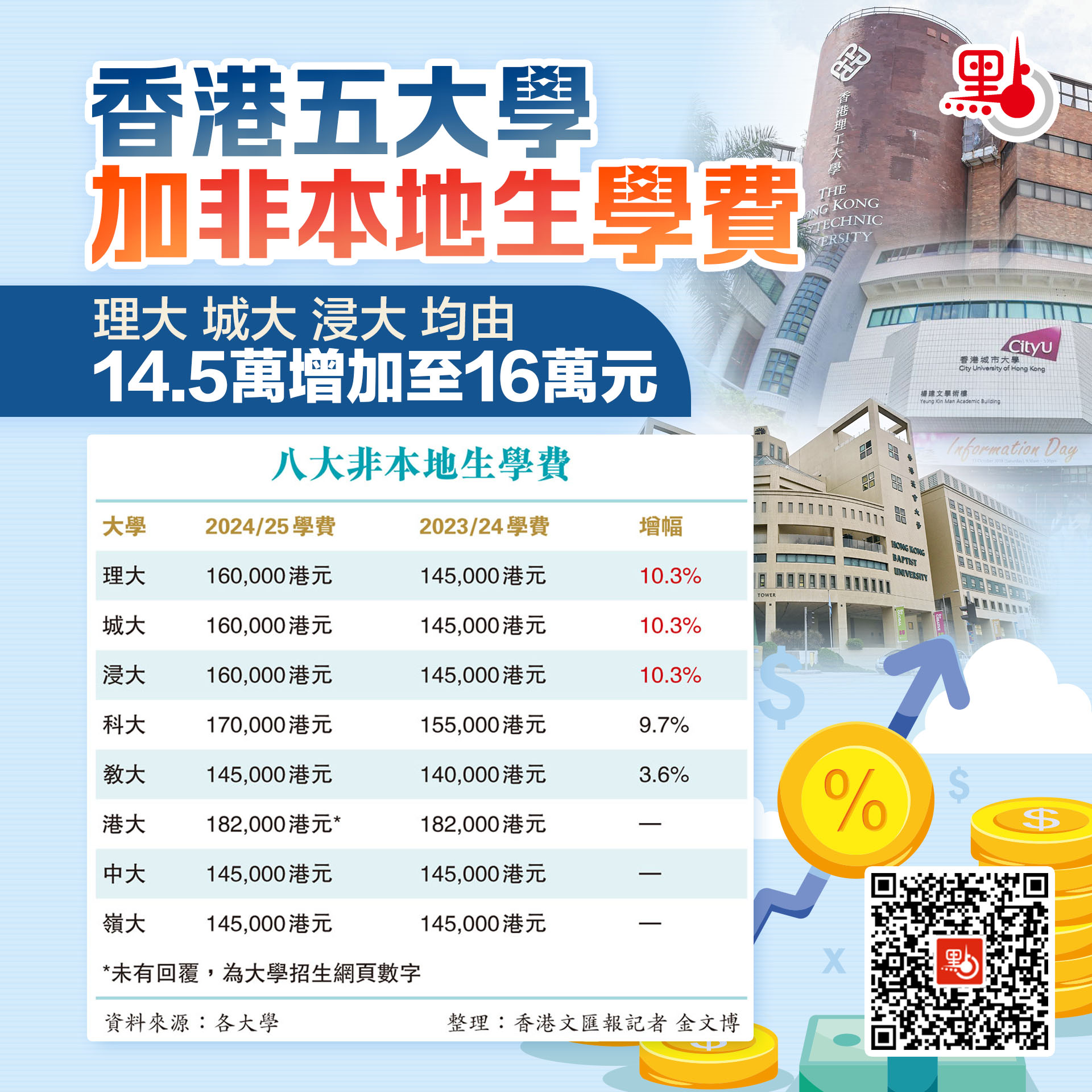 根據八大回覆香港文匯報查詢及收生網頁資料顯示,有5所大學將會在新學年增加非本地生學費,其中,理大、城大及浸大均由14.5萬元增加至16萬元,加幅10.3%;科大則加費9.7%至17萬元;而教大由14萬元增加3.6%至14.5萬元。