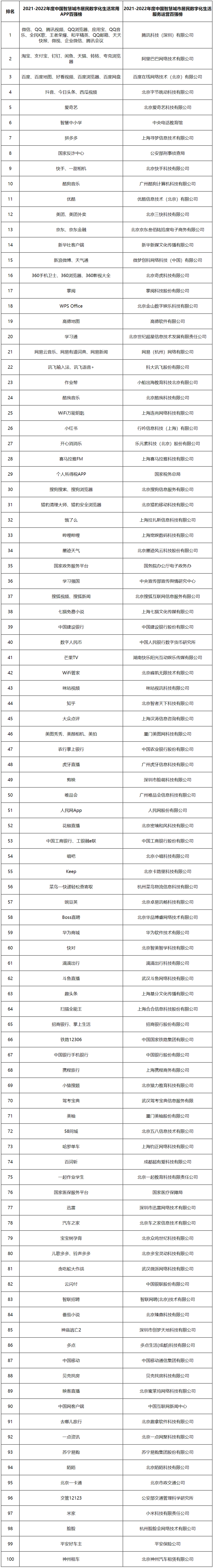 2021-2022年度中國智慧城市居民優秀數字化生活服務運營百強榜單