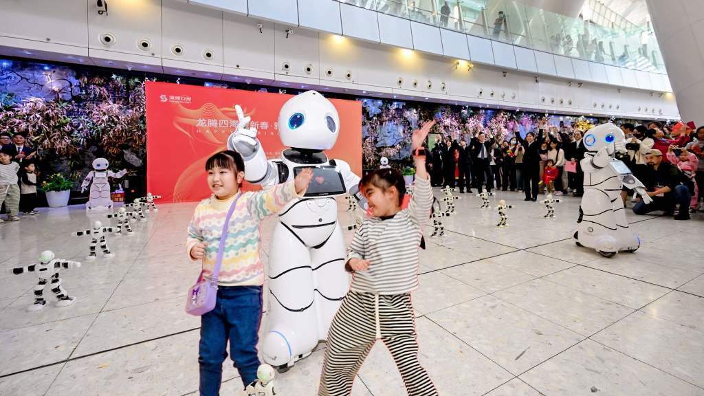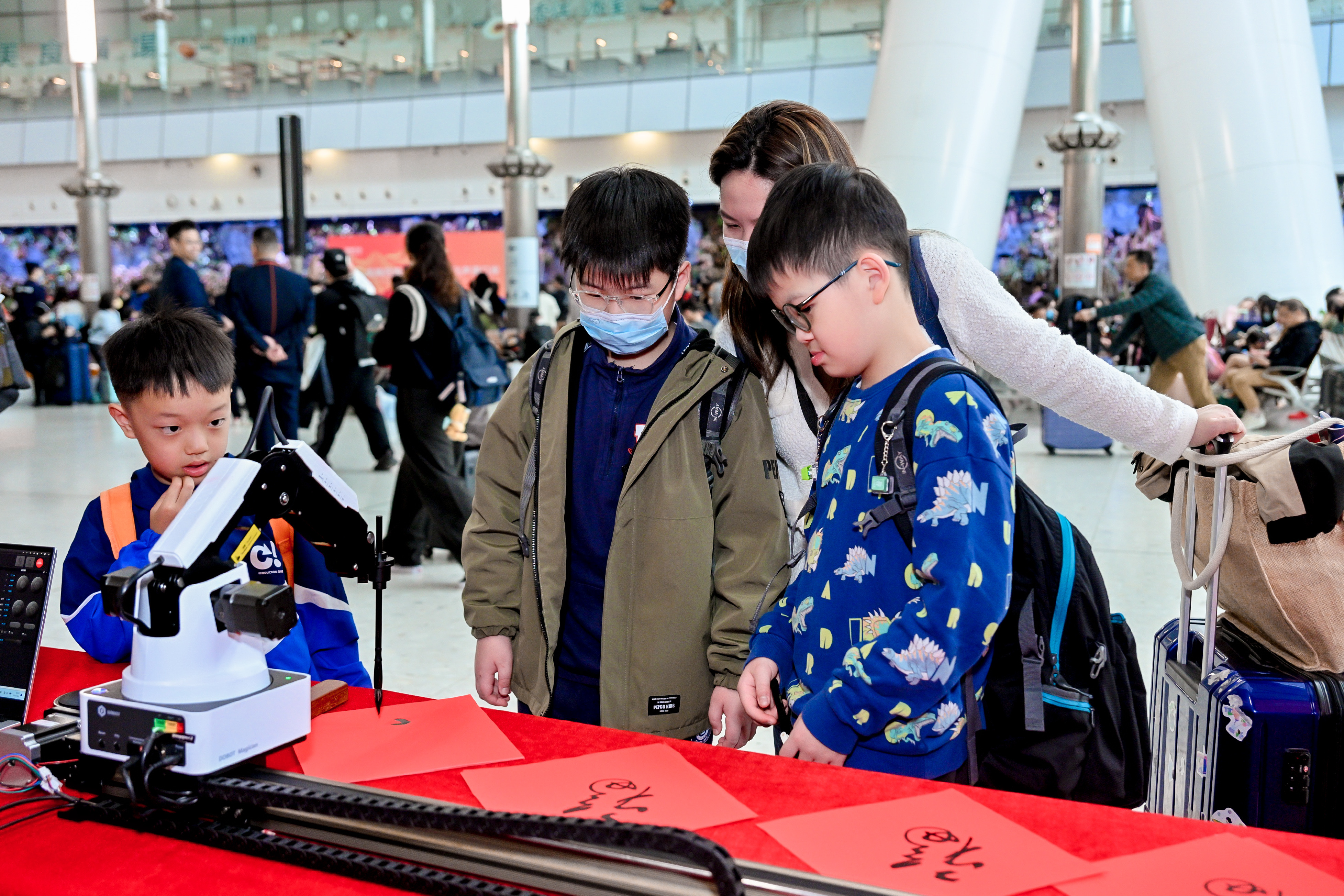 在這場新春快閃匯演中,32個紫荊智能機器人翩翩起舞,與現場觀眾頻繁互動,帶來歡快的音樂節奏。這些智能機器人還為旅客寫揮春送福字,讓候車過程不再枯燥無味,而是充滿了驚喜與暖意。