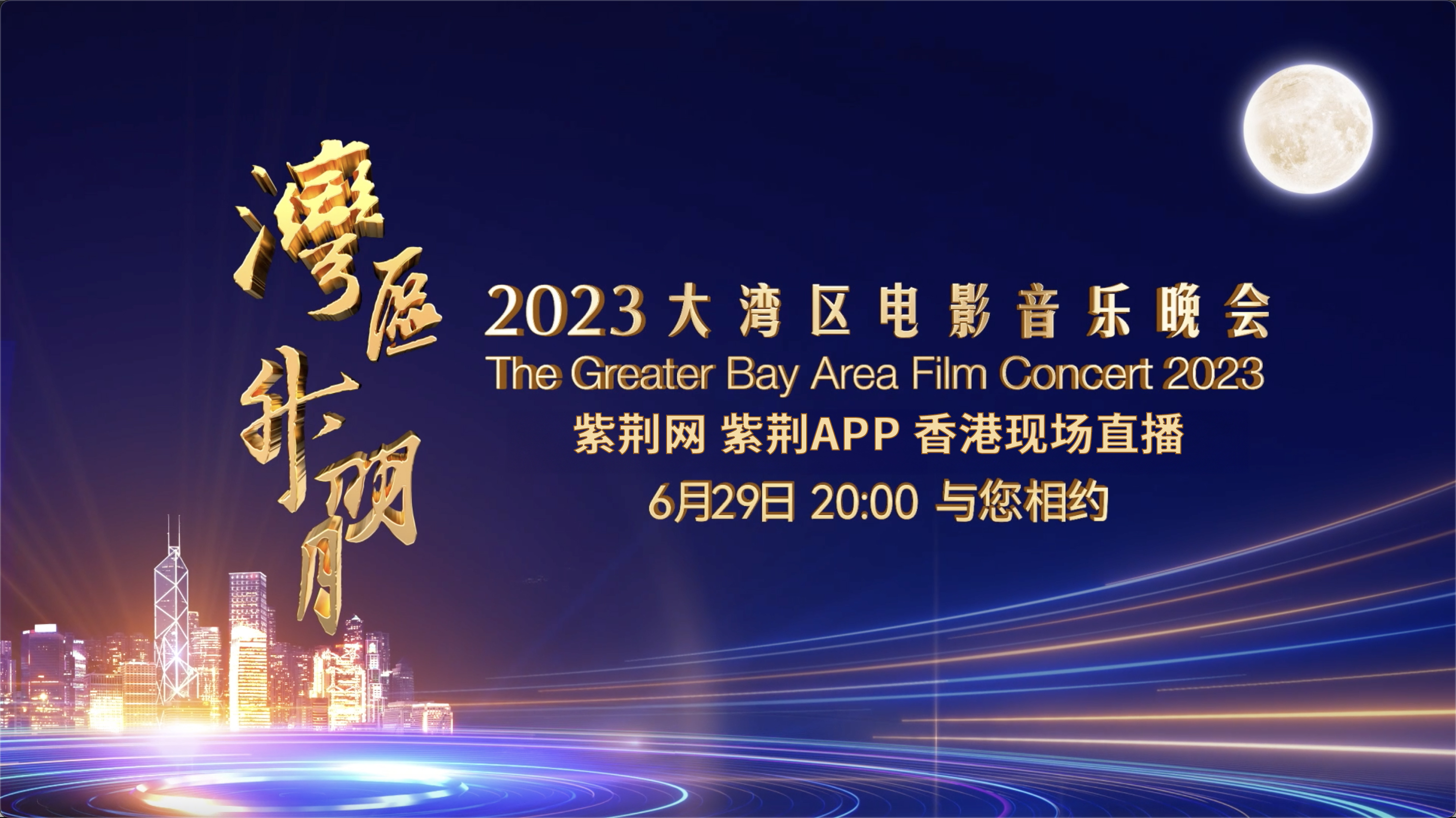 “灣區升明月”2023大灣區電影音樂晚會由電影頻道節目中心、紫荊文化集團、鳳凰衛視聯合主辦,電視廣播有限公司(TVB)、深圳廣播電影電視集團承辦,英皇娛樂集團協辦,將於6月29日晚20:00,在CCTV6電影頻道、鳳凰衛視中文台、鳳凰衛視香港台、廣東衛視、深圳衛視、香港電台、澳廣視、澳亞衛視等電視平台直播,中央廣播電視總台、香港TVB,電影頻道融媒體、1905電影網、紫荊網、鳳凰網、紫荊雜誌APP、鳳凰秀等全網主要媒體平台同步播出。
