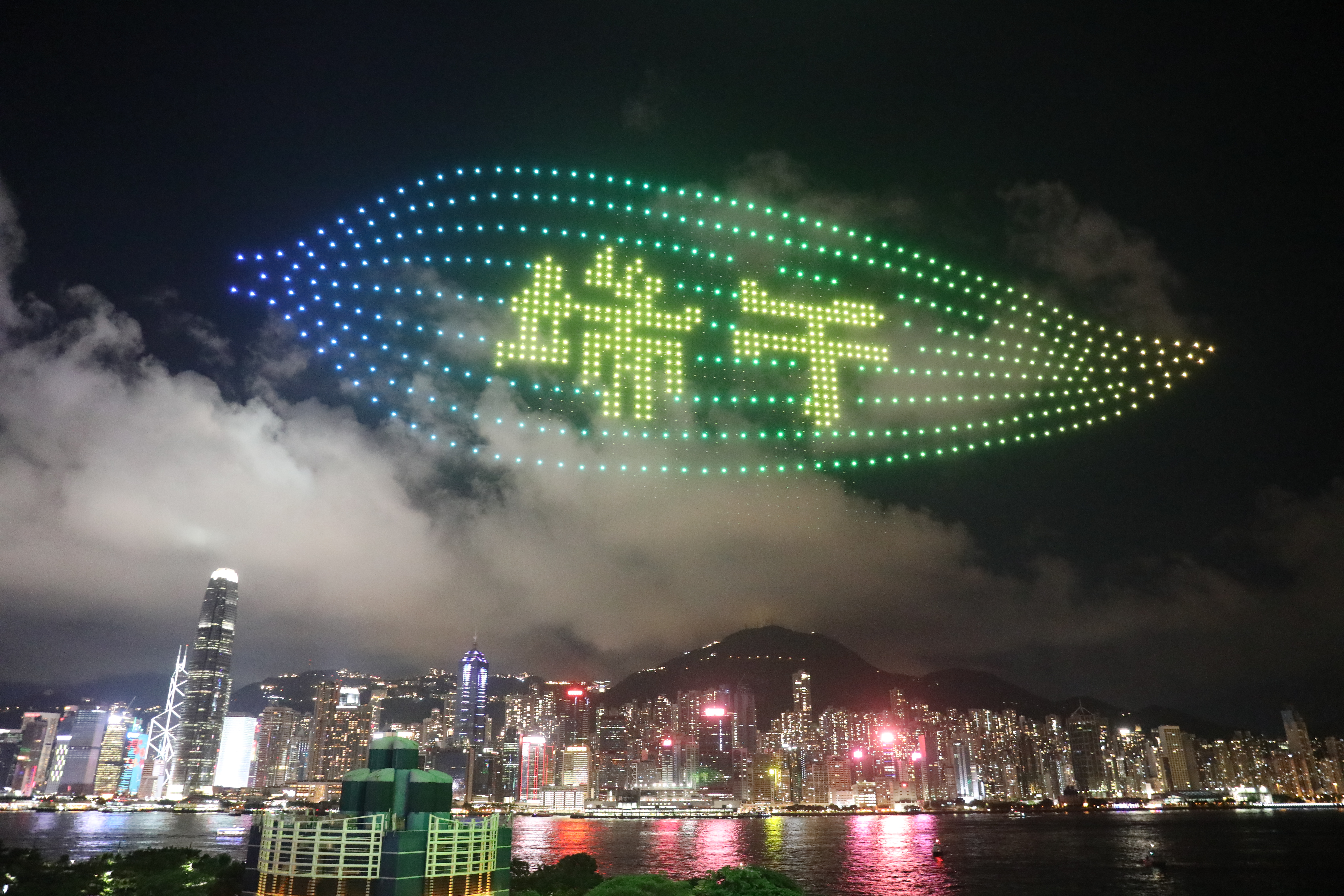 “濃濃粽葉香,歲歲皆安康,擂鼓賽龍舟,希望寫香江”,夜空中,無人機隊組合成多種色彩艷麗的圖案,為香港市民送上端午祝福。