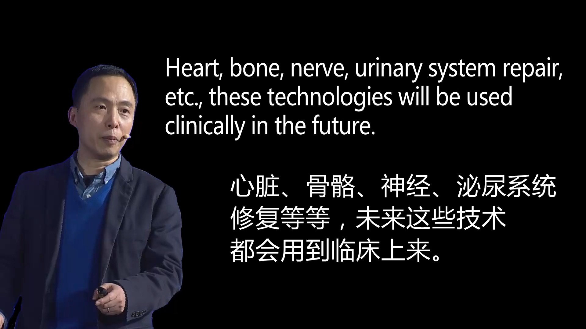 再生醫學專家、中科院遺傳與發育生物學研究所研究員戴建武表示,在過去幾年裡心臟、骨骼、神經、泌尿系統的研究都有階段性的成功,未來幾年這些技術都會用到臨床上來。再生醫學的發展將使人體的所有組織器官都能再生,我們許多人都可以健康地活到120歲。(紫荊新媒體、CC講壇聯合製作)