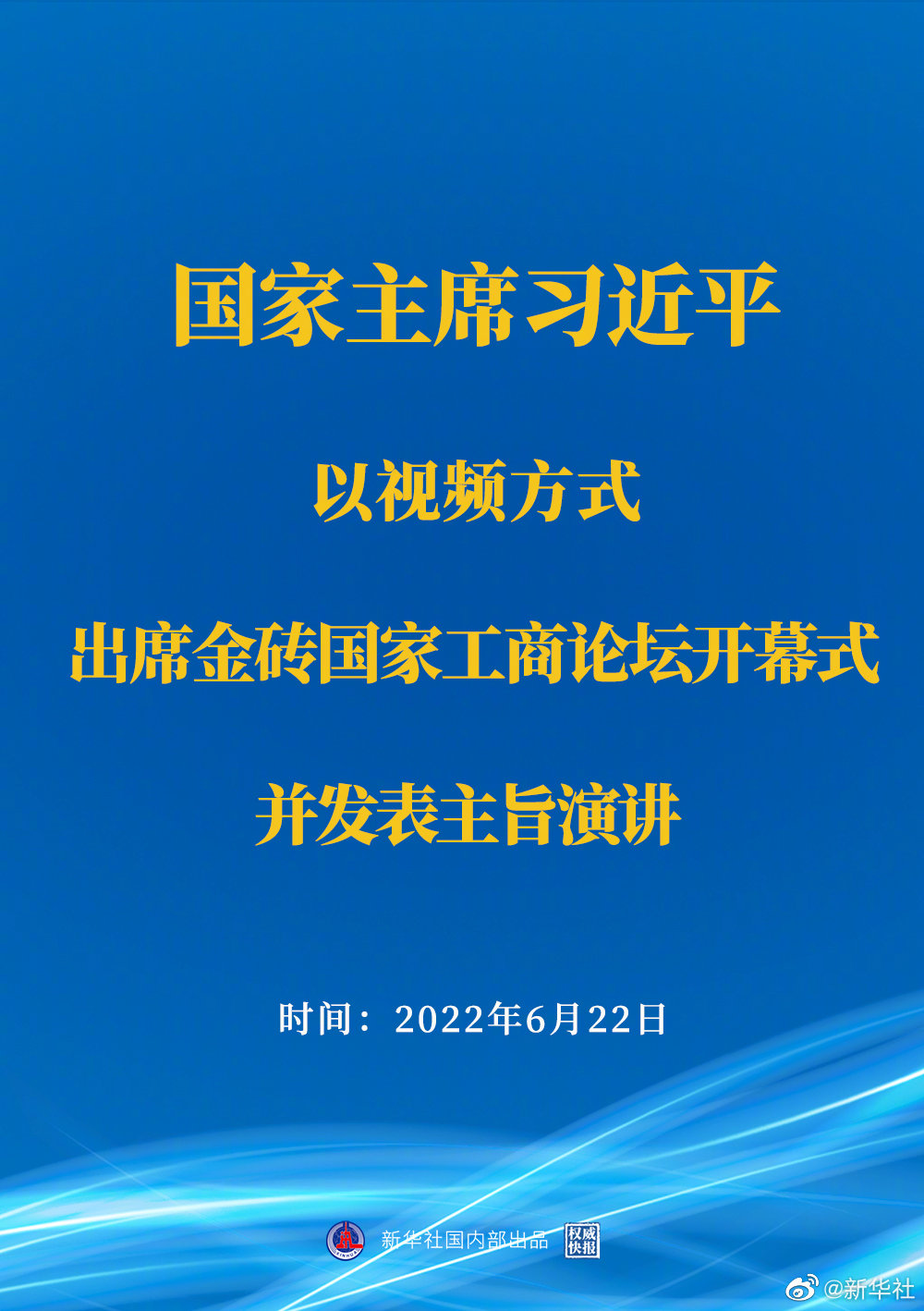 6月22日晚,國家主席習近平以視頻方式出席金磚國家工商論壇開幕式並發表題為《把握時代潮流 締造光明未來》的主旨演講。