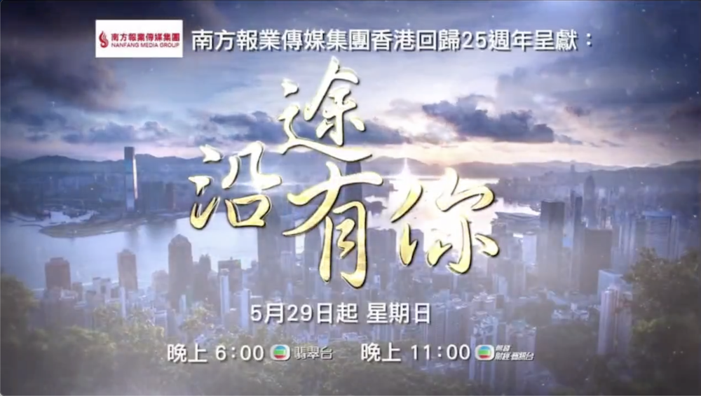 為慶祝香港回歸25周年、《粵港澳大灣區發展規劃綱要》發布3周年,由南方報業傳媒集團製作的6集專題片《沿途有你》,於今晚18:00在香港翡翠台播出第一集。