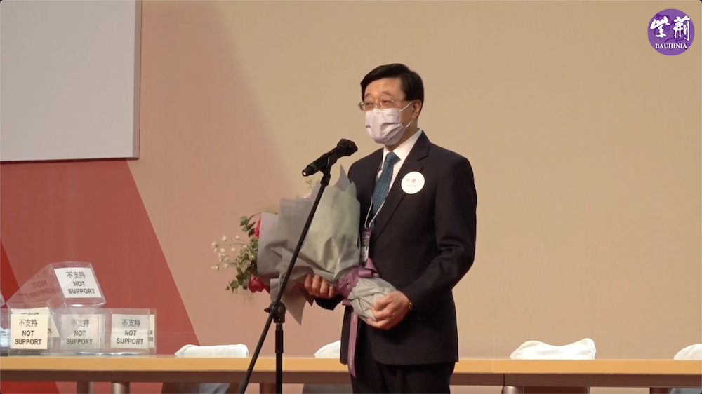 李家超現場發表當選感言,衷心感謝到場投票的每一位選委以及電視機前的香港市民,感謝大家給予的支持和鼓勵。