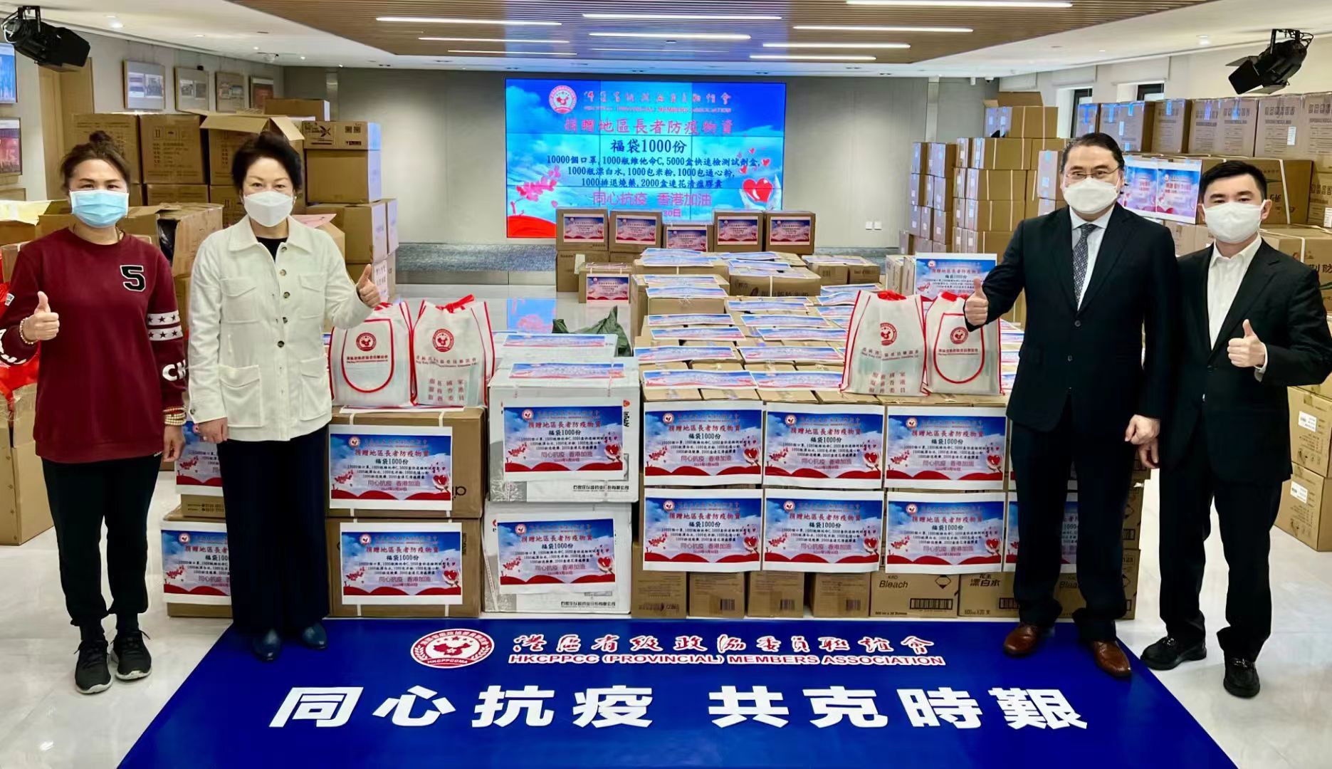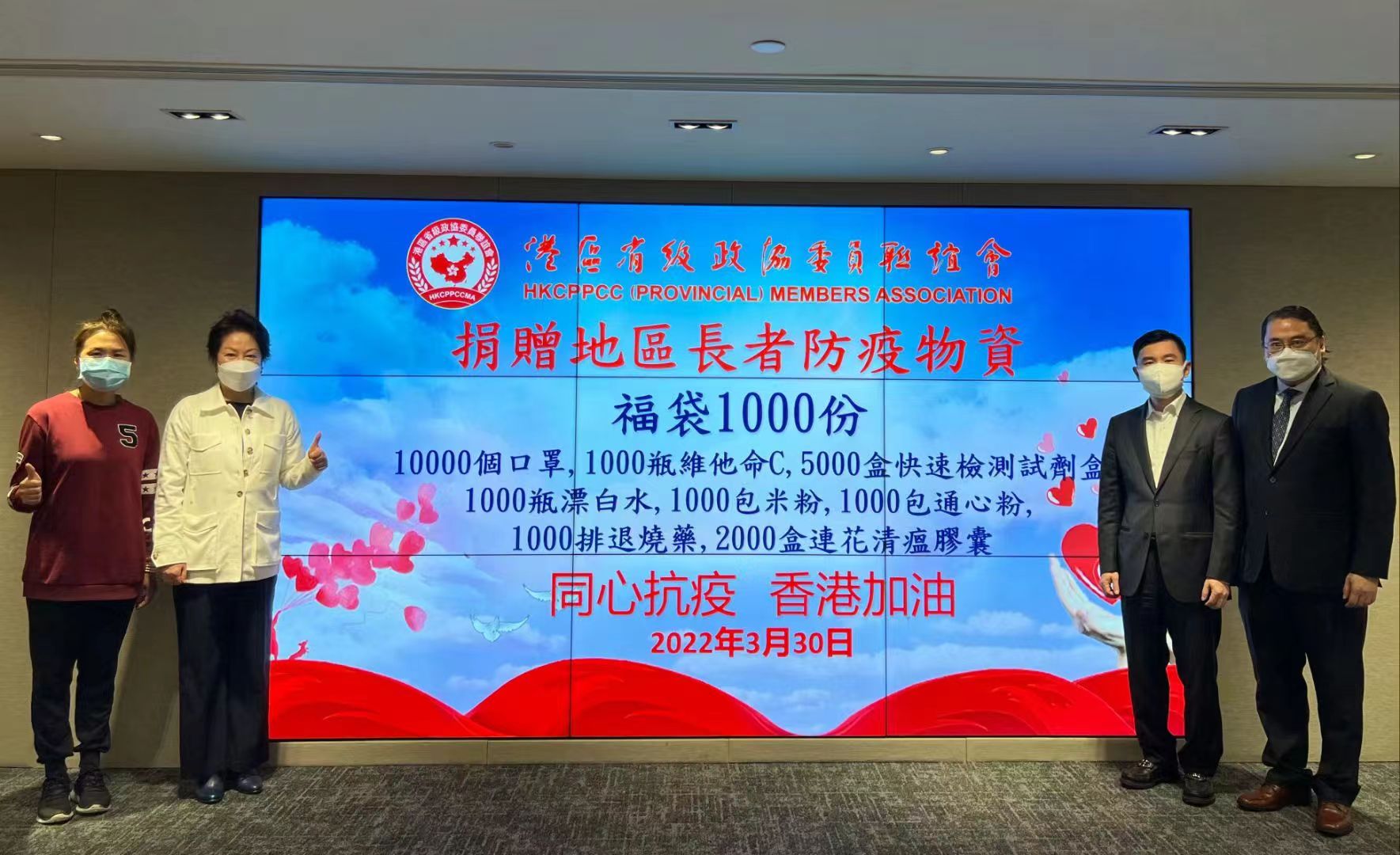 港區省級政協委員聯誼會後續還將向香港重慶總會捐贈700套快速檢測試劑盒、288盒荊防顆粒、4,000個口罩。港區省級政協委員聯誼會希望能夠幫到有需要的人,大家齊心協力,早日戰勝疫情,民眾安康,社會儘快恢復正常。