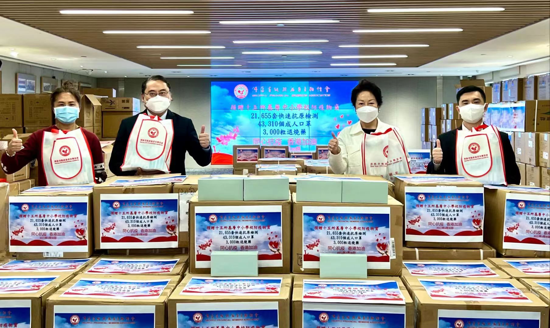 今日(30日),港區省級政協委員聯誼會再度向23個機構捐出價值近百萬元抗疫物資,其中包括30,055套快速檢測試劑盒,67,310個口罩,1,000瓶維他命C,1,000瓶漂白水,1,000包米粉,1,000包通心粉,13,000粒退燒藥,2,000盒連花清瘟,1,008盒荊防顆粒。港區省級政協委員聯誼會此次捐贈對象分別為十五所基層中小學、六家接收地區長者物資機構、香港甘肅聯誼會和香港重慶總會。這批物資由港區省級政協委員聯誼會自行購買和委員捐贈構成。