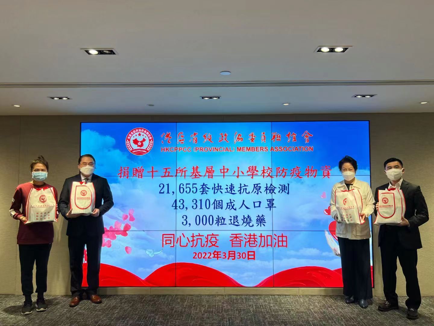 港區省級政協委員聯誼會副會長、河北省政協常委、召集人李耀新,港區省級政協委員聯誼會副會長、福建省政協常委林潞,港區省級政協委員聯誼會副會長、吉林省政協常委徐莉出席捐贈儀式。他們表示,防疫抗疫需要全社會的共同努力,作為政協委員更應該用實際行動与香港各界同心協力抗疫,跨越當前考驗。希望這批物資能夠幫助到中小學校的師生,讓他們能更加安心的投入學習和工作。同時也強調,經歷過第五波疫情的至暗時刻,面對安老院失守,老人家作為高危人群,希望這批物資能夠支援地區長者。大家齊心抗疫,定可戰勝疫情。