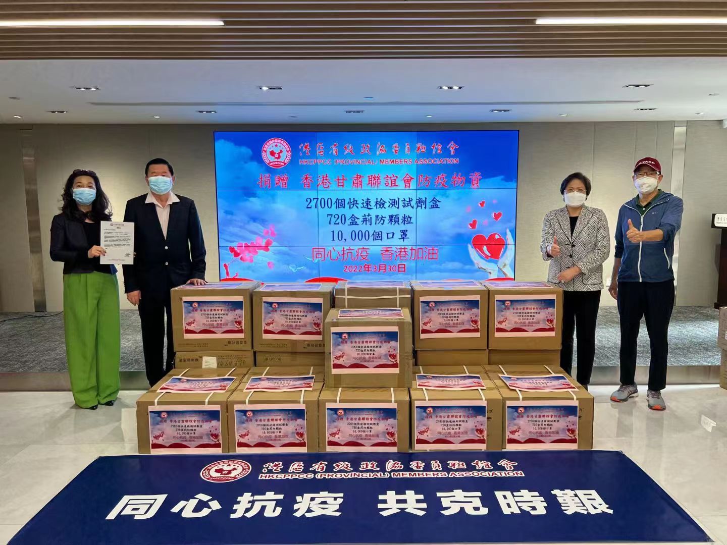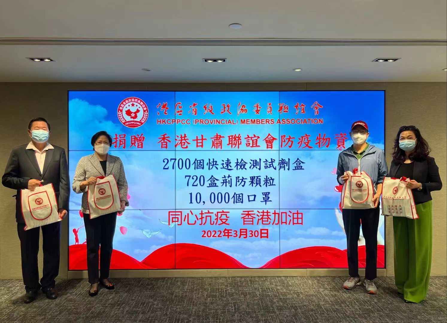 此外另一批物資於3月30日下午贈予香港甘肅聯誼會,其中包括:2,700套快速檢測試劑盒、720盒荊防顆粒、1萬個口罩。港區省級政協委員聯誼會副會長、廈門市政協常委王少華代表本會出席捐贈,香港甘肅聯誼會執行會長、甘肅省政協常委、召集人譚岳衡,香港甘肅聯誼會副會長、甘肅省政協常委、召集人陳端亮,香港甘肅聯誼會秘書長、甘肅省政協委員周玟秀出席,接受捐贈並致送感謝信。由港區甘肅省政協委員組成的香港甘肅聯誼會積極參與防疫抗疫工作,各位政協委員帶領義工隊奔走多個社區,為基層市民派發抗疫包,向有需要的人士及時送上物資保障。香港甘肅聯誼會的代表們表示,將儘快妥善派發獲贈的物資,為本港防疫抗疫工作貢獻持久穩定的力量。
