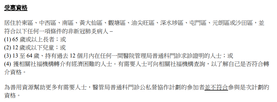 計劃下的五間社福機構,包括香港復康會、基督教家庭服務中心、博愛醫院、九龍樂善堂,以及香港仔街坊會,將與非牟利診所及私家診所合作,提供可負擔的門診服務。合資格人士只需繳付50港元診金,便可獲得診症服務及三日基本藥物。計劃詳情可點此下載。
