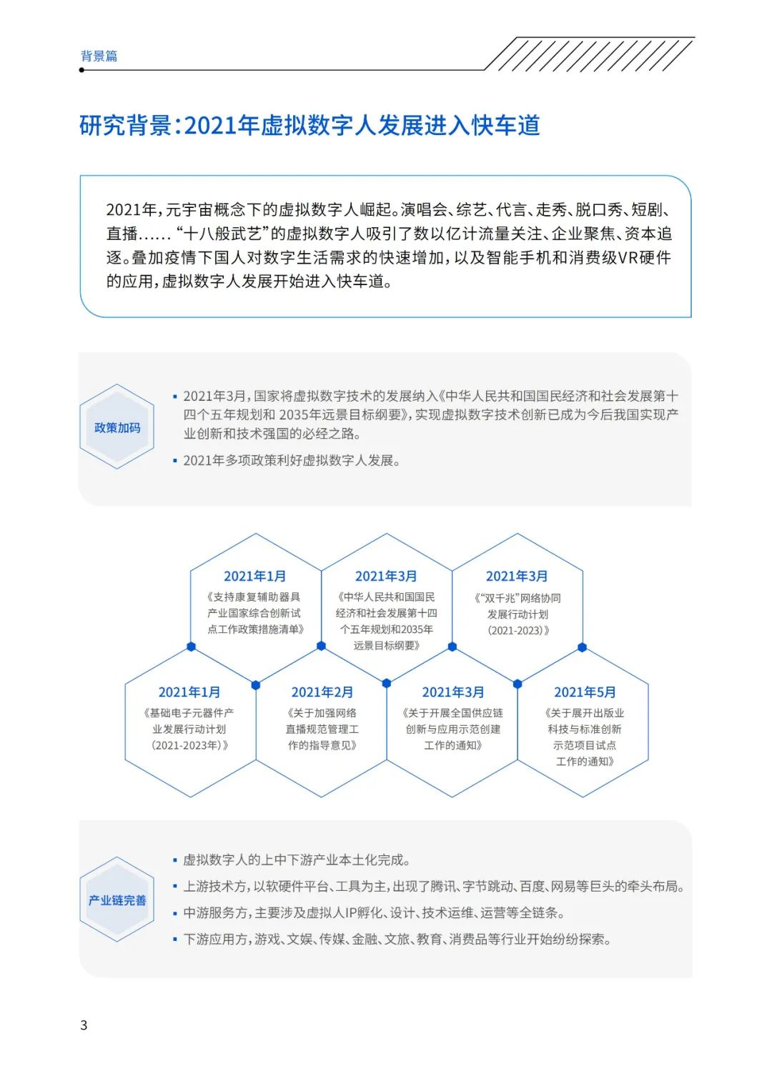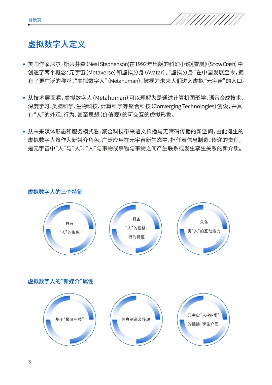 報告指出,2021年元宇宙概念興起,疊加疫情下國人對虛擬內容需求增加、消費級VR硬件快速發展,虛擬數字人發展進入快車道。報告從未來媒體形態和服務模式重新定義了“虛擬數字人”:計算機圖形學、語音合成技術、深度學習、類腦科學、生物科技、計算科學等聚合科技(Converging Technologies)帶來語義傳播與無障礙傳播的新空間,由此誕生的虛擬數字人將以新媒介角色,廣泛應用在元宇宙新生態中,擔任著信息製造、傳遞的責任,是元宇宙中“人”與“人”、“人”與事物或事物與事物之間產生聯繫或發生孿生關係的新介質。