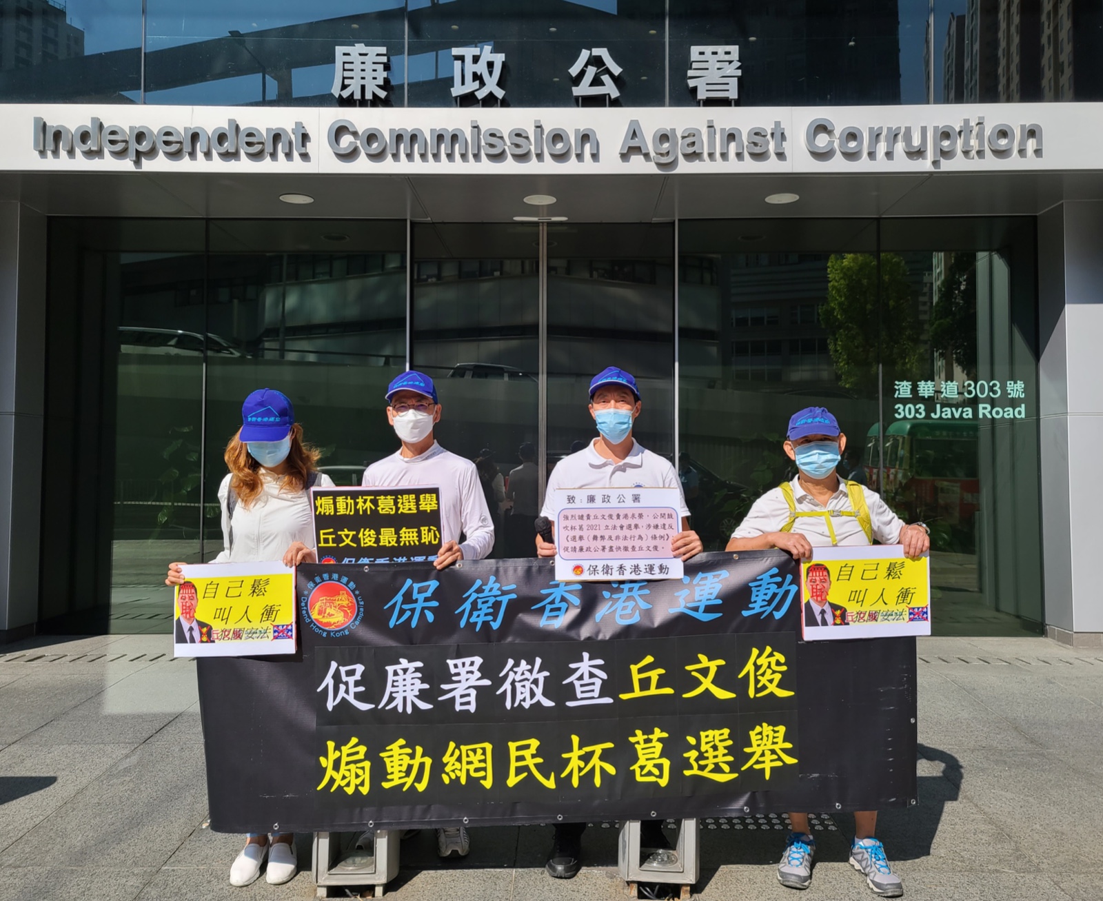 今日(2日)下午,香港團體“保衛香港運動”於廉政公署總部前舉行“快徹查丘文俊擾亂選舉”集會,促廉政公署儘快徹查曾公開鼓吹“全民杯葛2021立法會選舉、不投票、不參選”的丘文俊的言行及其資金來源,其涉嫌違反《選舉(舞弊及非法行為)條例》及香港國安法。