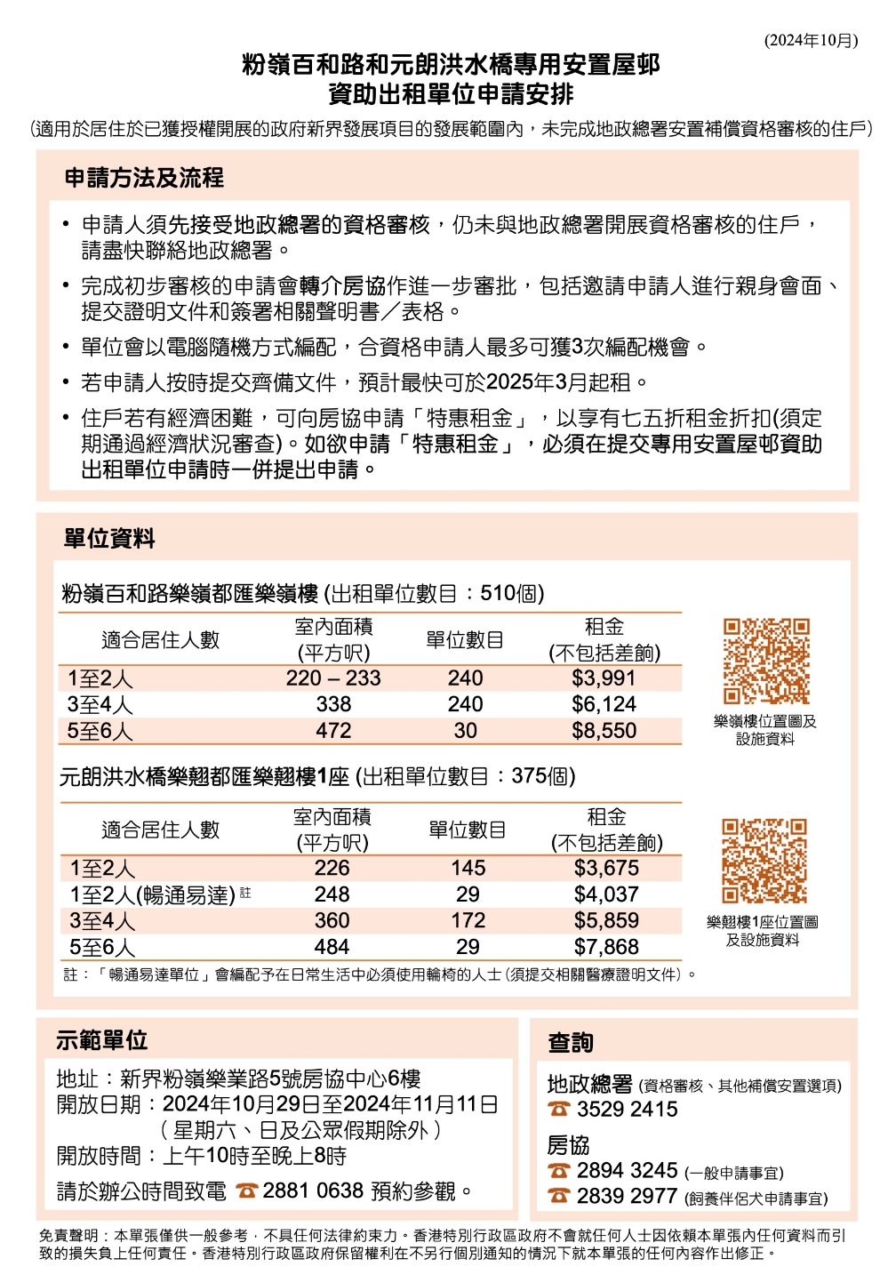 - 有關的申請期(10月29日至11月11日)只適用於入住房協/房委會現有屋邨暫租住屋單位的住戶,房協已向他們發信邀請申請。仍未遷出發展範圍的住戶則沒有特定的申請限期,可在遷出限期前隨時遞交申請。詳情可見附圖的簡介單張。