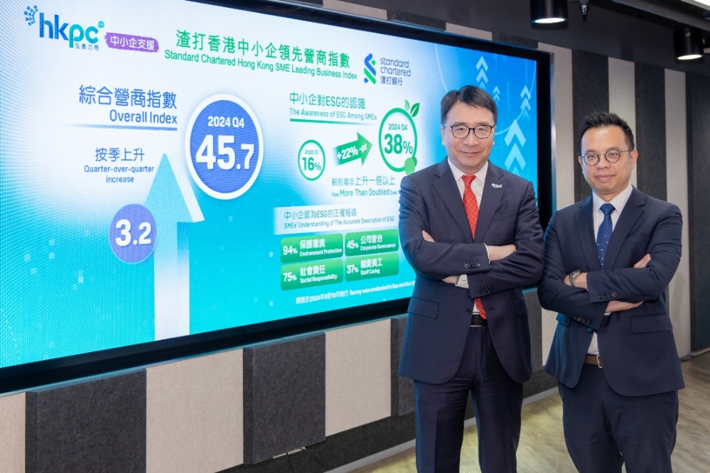 生產力局今天公布2024年第四季「渣打香港中小企領先營商指數」(「渣打中小企指數」)。調查結果顯示,本季綜合營商指數較上季上升3.2至45.7,回升至2023年第三季的水平。五大分項指數1中,其中三項有明顯增長,包括「盈利表現」(41.9,+6.8)、「環球經濟」(36.2,+6.7)及「營業狀況」(44.3,+4.9),並重回2024年第二季水平;另外,「招聘意向」錄得輕微升幅(50.6,+1.0)。而「投資意向」(48.9,-0.1)繼續維持於接近50中性水平線,反映中小企在投資方面保持樂觀審慎態度。