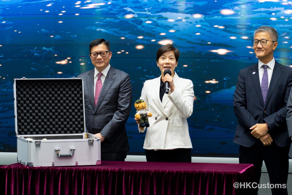 香港海關關長何珮珊於十月二十九日與「Customs YES」會員一同進行開箱儀式,見證這個歷史時刻!當中熊公仔象徵着充滿活力與希望的青年會員,旗幟象徵今年成立的「專隊」,而相冊則特別呈現了「專隊」於今年七月在海關學院結業會操中首次亮相,與海關儀仗隊及結業學員共同拼出「天安門城樓」及「75」的圖案,充分展現愛國情懷。這面旗幟及相冊承載着「專隊」成員在日常刻苦訓練中的汗水與努力,象徵着堅持和夢想,傳遞了對國家和香港的忠誠與熱愛。