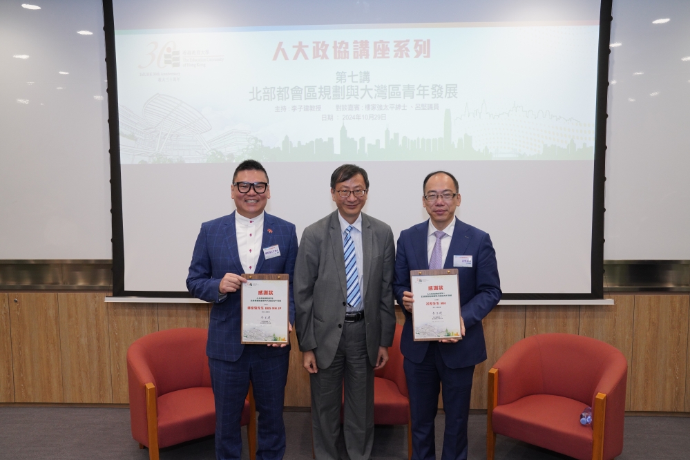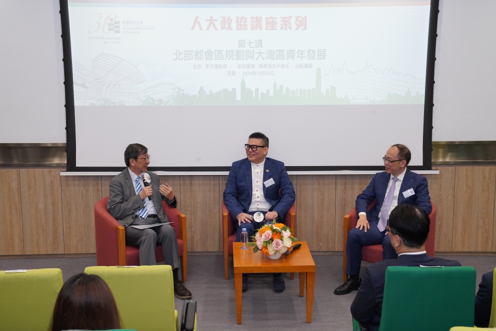 香港教育大學(教大)10月29日於北角教學中心舉辦「人大政協講座系列」第七講,由第十四屆港區全國人大代表、大灣區青年新動力及惠州新動力創會主席樓家強先生,以及第十四屆港區全國政協委員、元朗區議會議員呂堅先生擔任主講嘉賓,以「北部都會區規劃與大灣區青年發展」為題,探討大灣區青年應如何把握機會以獲得更好的發展。