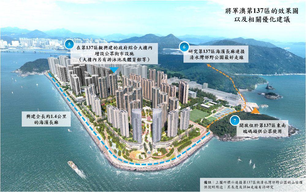 政府致力把將軍澳第137區發展成為一個綠色宜居、配套完善及交通便利的海濱新社區,並藉此機會為將軍澳社區整體帶來更多裨益。我們衷心感謝關注將軍澳區發展的立法會及區議會議員、地區團體及居民,在過往一年多給予我們不少寶貴意見和地區智慧。