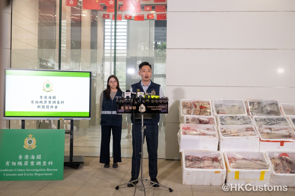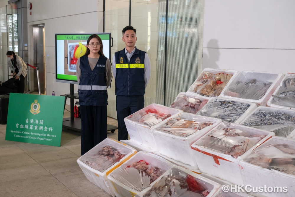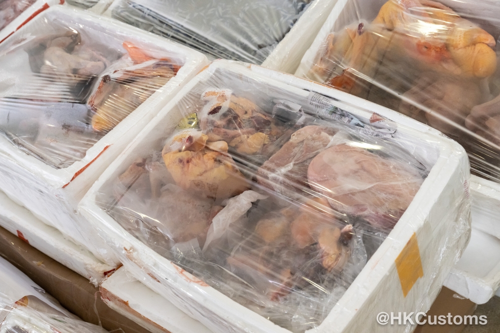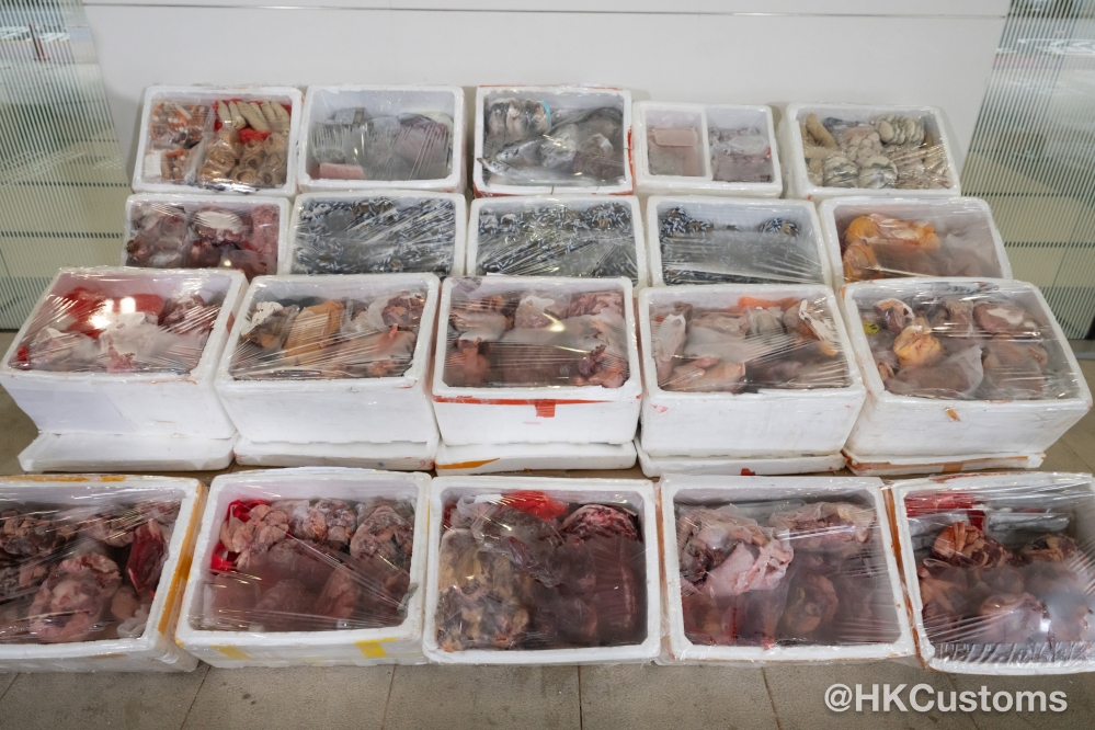 行動中,海關人員共檢獲約 300 公斤凍肉及 1000 公斤食品,包括大閘蟹、海產和急凍食物,估計市值共約十萬元。