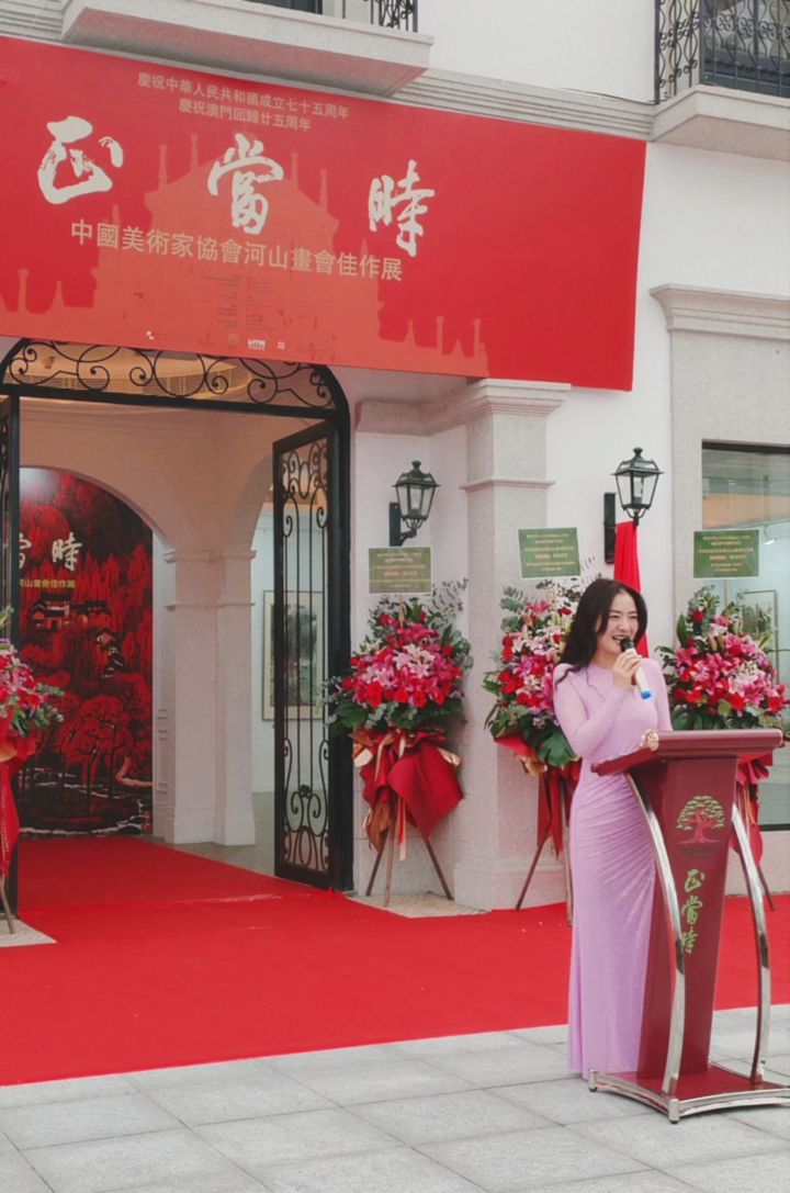 李可染畫院香港特派員、香港一語文化創始人,本次活動的中華傳統文化推廣人及策展人郭玥伶表示,澳門是多元文化的發展寶地,是整個中國翻天覆地發展變化大好河山下的獨特代表。而且今年正值澳門回歸祖國的風華正茂之“25”,正在青春能量正當時,所以她把此次展覽命名為“正當時”,借助25這個青春年少的數字,把這次展覽推廣到大眾眼前。大家推行中華傳統文化的步伐,正當時。她希望此次展覽的開幕,可以拉開中華傳統文化的鏈接,由澳門開啟,把祖國的美好河山紅遍世界。