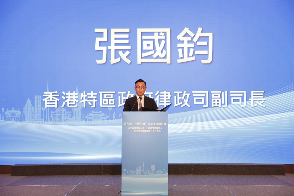 值澳門回歸祖國25周年之際,第九屆“一國兩制”與基本法研討會於11月26日在澳門舉辦。本次研討會以“站在新的發展起點,共創澳門美好明天”為主題,來自學術界、法律界、政商界、金融界、出版界等嘉賓共約180人出席。香港特區政府律政司副司長張國鈞出席並致辭,他表示,澳門回歸祖國25周年以來,“一國兩制”制度優勢得到充分發揮,使澳門發展成為國際大都市,取得舉世矚目的成就,開創發展新局面。站在這個新發展起點上,香港和澳門兩個特區要聚焦未來,聯同粵港澳大灣區九市把握“一國、兩制、三法域”的獨特優勢,深化合作,推進建設,提升在國家經濟發展和全方位開放中的引領作用。致辭全文如下: