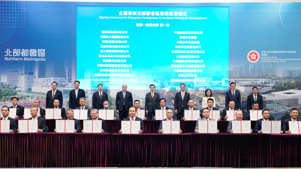 當天上午,近40家企業代表實地考察北部都會區,瞭解整體規劃和現場建設情況,切身感受北部都會區蘊藏的巨大發展機遇。下午,85家企業與特區政府簽署《支持及參與北部都會區發展意向書》。35家企業簽署參與北部都會區開發項目協議32份,金額超千億港元,涉及基礎設施建設、住房和民生服務、創新科技、銀企合作等領域,形成齊心協力支持特區政府拼經濟、謀發展的生動局面。