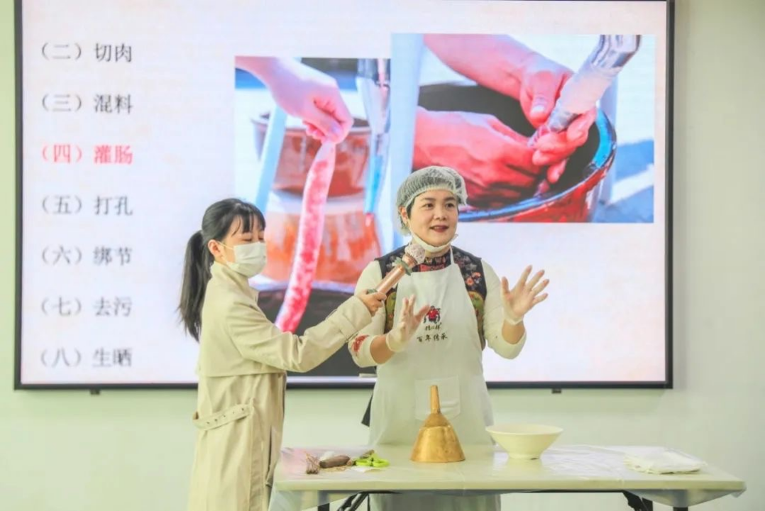 活動安排矮仔腸製作體驗環節,在非遺傳承人“嬋姐”的耐心講解下,大家認真完成剁肉、配料、混拌、灌腸、打孔、綁節以及去污的每一步驟,不一會兒一段段的臘腸就完成了。“都說高埗矮仔腸美味可口,果然名不虛傳。臘腸之所以這麼香,是因為材料新鮮,配料比例搭配得好!”道滘鎮的一名企業高層次人才興奮地告訴小編。