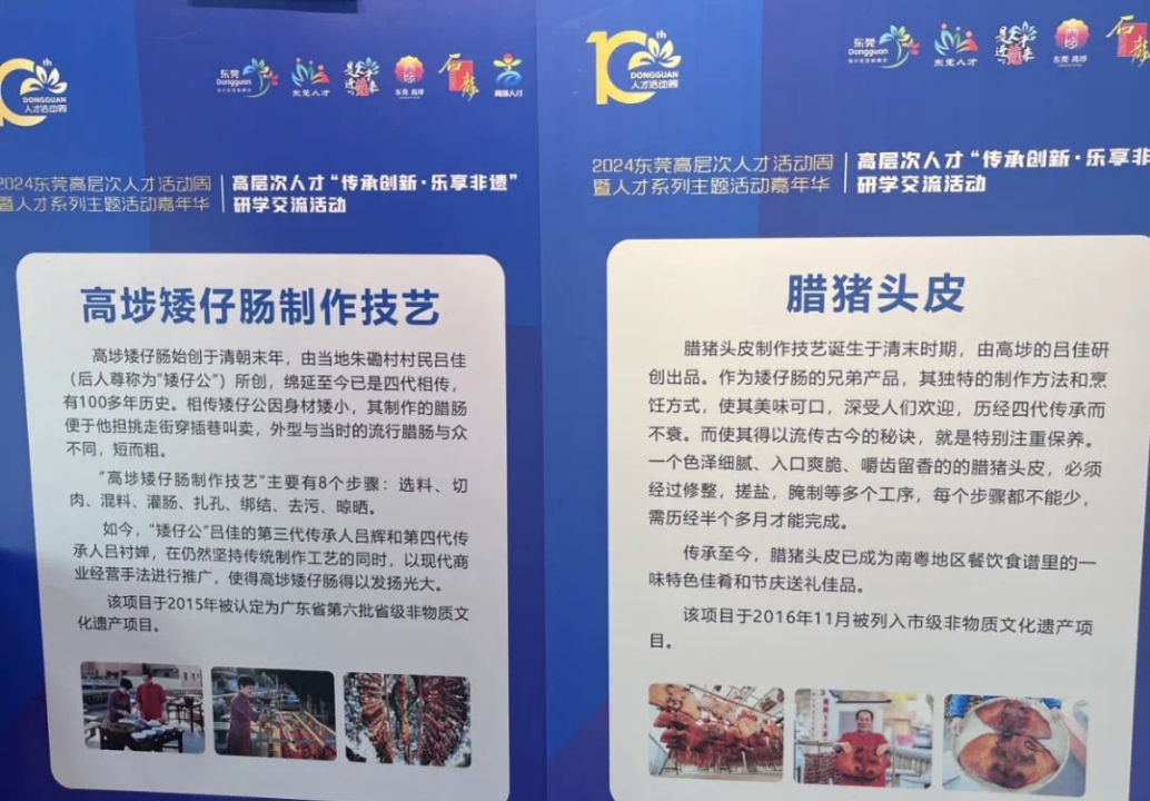 高埗、石龍兩處活動現場均精心設置美食攤位,陳列著各式各樣的特色非遺美食,令人目不暇接。其中,矮仔腸、冼沙魚丸、保安圍扣肉、酒煮咸姜水、咸湯丸、麥牙糖柚子皮等非遺美食尤為引人注目,它們與一系列充滿水鄉特色的地道小吃共同構成了一場味覺盛宴,香氣撲鼻,令人垂涎欲滴。“我是東莞本地人,但陳皮臘腸和麥牙糖柚子皮燉蛋還是頭一回品嘗到,融合傳統和創新的理念,味道很棒。”人才代表品嘗過後紛紛贊不絕口。