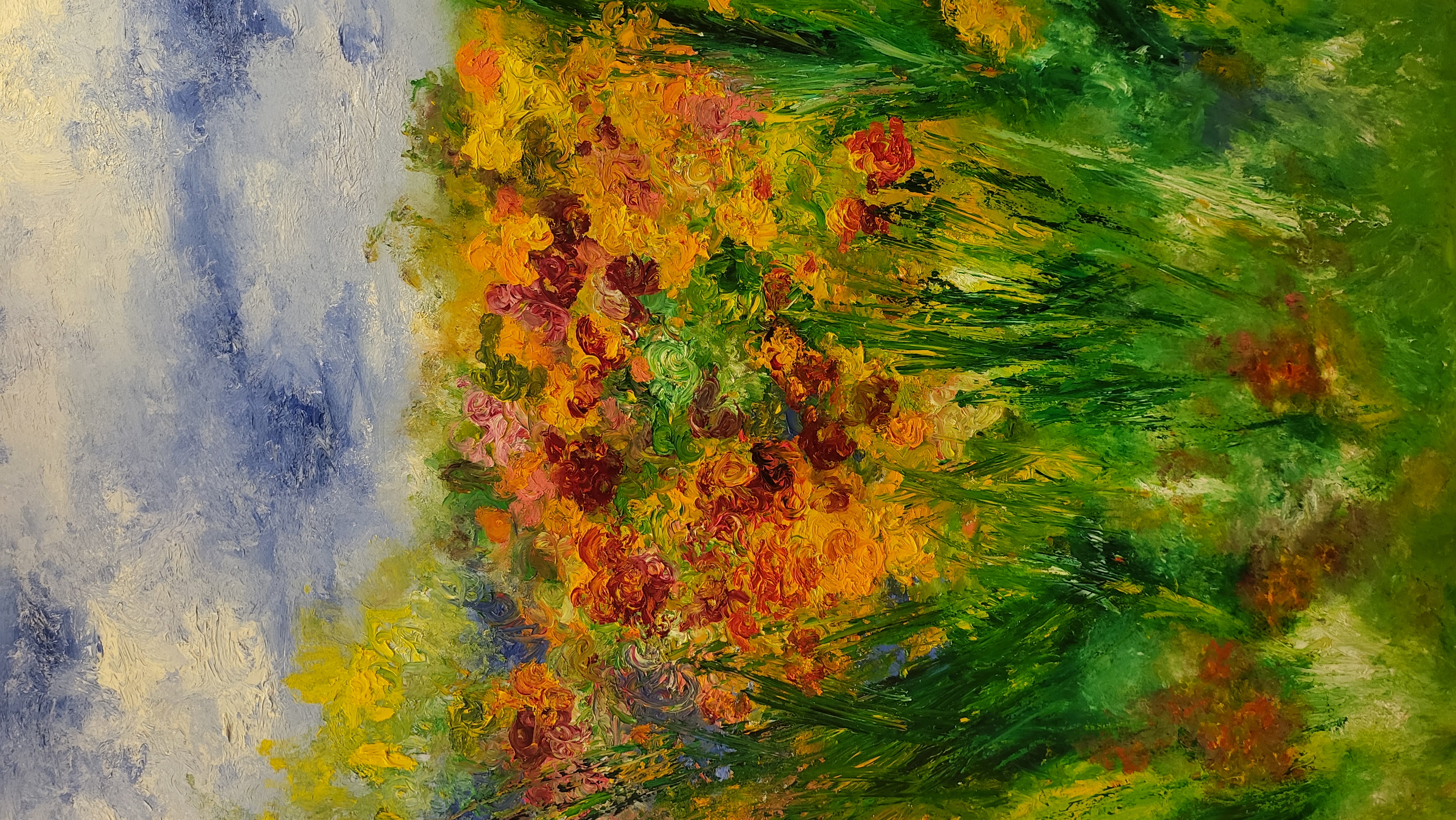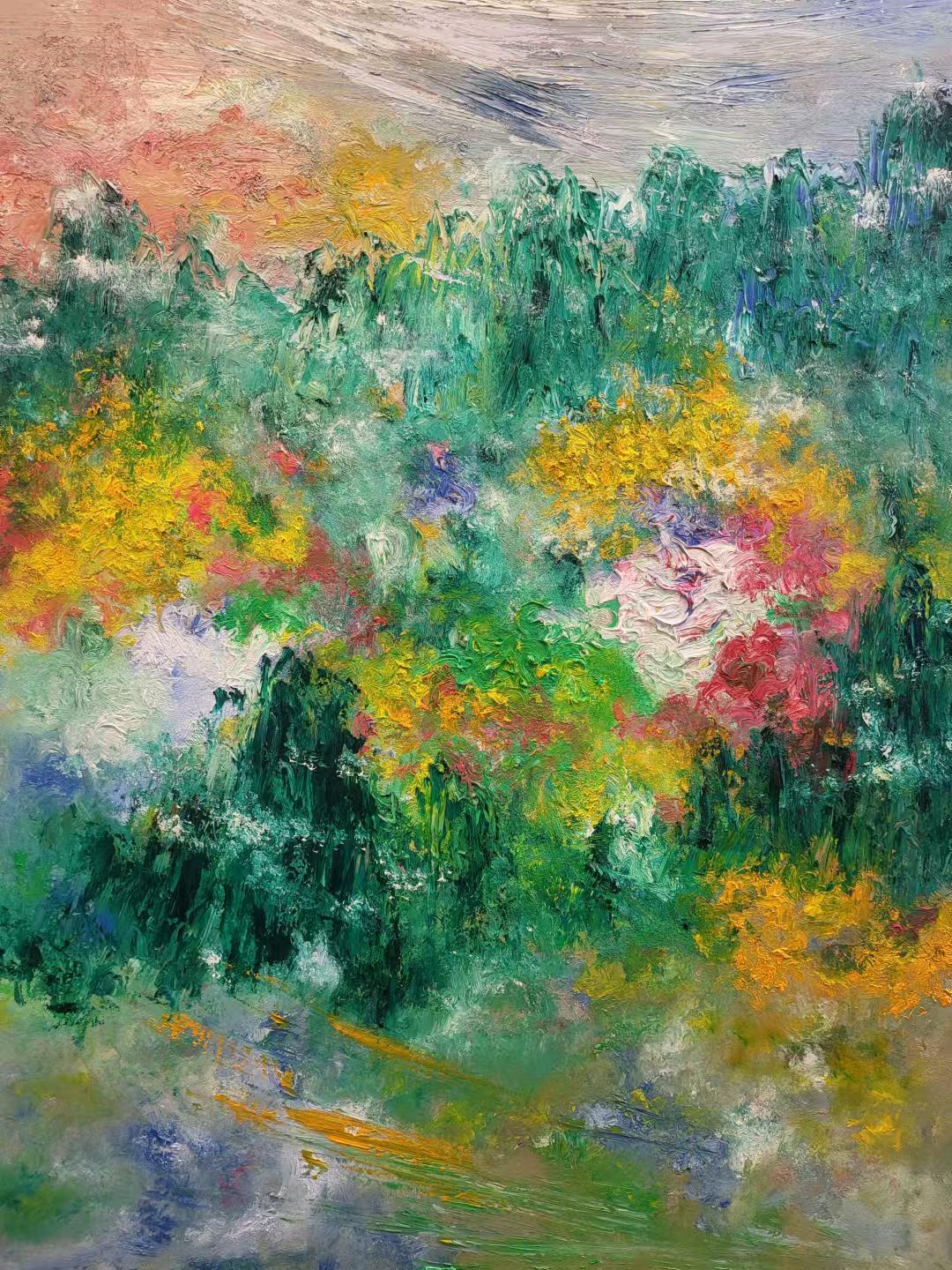 「心花怒放|Burst of Joy」是此次「素珊畫|Susan Art」的代表作之一,這幅畫作的靈感源自於今年夏天楊素珊在巴黎觀看奧運會時中國跳水隊獲得勝利的激動、雀躍與自豪的心情。夏日的歐洲,似大地打翻的調色盤,灑滿明媚陽光,白日時光漫長,藍天白雲映襯著多彩的自然萬物,到處都是綠意青蔥,鮮花盛開。觀賽後喜悅的心情與身處美景時的非凡感受交織,使得楊素珊這份明亮燦爛的歡樂心情透過對美景的描繪呼之欲出。她在此幅畫作中運用了塗抹的方式,用手指一點點暈開每一處花朵的顏色、每一處雲彩與天空交互的顏色,去細緻傳達那一份心底裡純粹的感受。