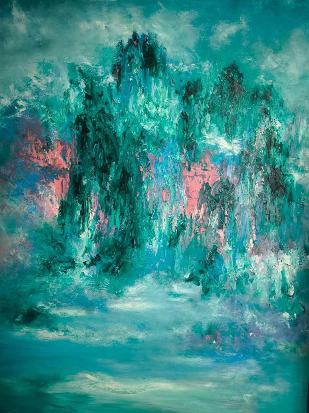 此幅「Harmony 1, 2024」是楊素珊遊覽桂林山水後所創作,青絲帶勾勒的山水畫軸浮現在眼前,秀麗挺拔的山峰與緩緩流淌的江水相互輝映,透過油畫的筆觸將桂林山水這份奇峰並起而聳拔挺立,起伏有序而氣勢磅礴的意境展現出來。此幅畫中點綴的粉紅色是楊素珊身臨其境此景時內心的直接感受,一份回歸自然、感受自然、融入自然時純粹的幸福。