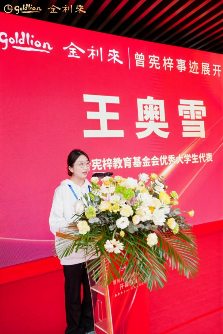 曾憲梓教育基金會優秀大學生代表王奧雪在發言中表示通過參觀曾憲梓故居及前往曾憲梓中學進行深入交流活動,深刻感受到曾憲梓先生傳奇的一生,領悟到真正的成功是對國家和社會的無私奉獻。她會繼續以曾憲梓先生為楷模,學會迎接困難,努力改變現狀,實現理想,將來報效祖國。