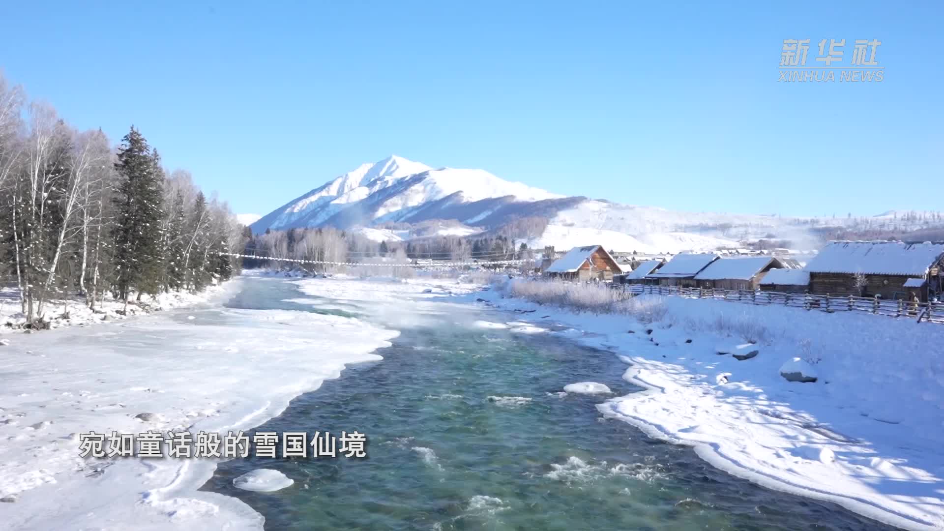 冬季,新疆阿勒泰地區禾木村被皚皚白雪覆蓋。從空中俯瞰,雲海氤氳,樹木凝霜掛雪,錯落有致的木屋被柔美的積雪覆蓋,宛如童話般的雪國仙境。
