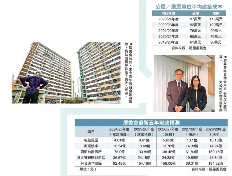 香港特區房委會昨日(9日)公布未來五年度財政預算,本年度及預測五年內的各賬目全部為盈餘,修訂2024/25年度綜合盈餘約92億元,並估算下一財政年度大幅上漲至154億元,合共246億元,當中資助出售單位仍是主要收入來源。