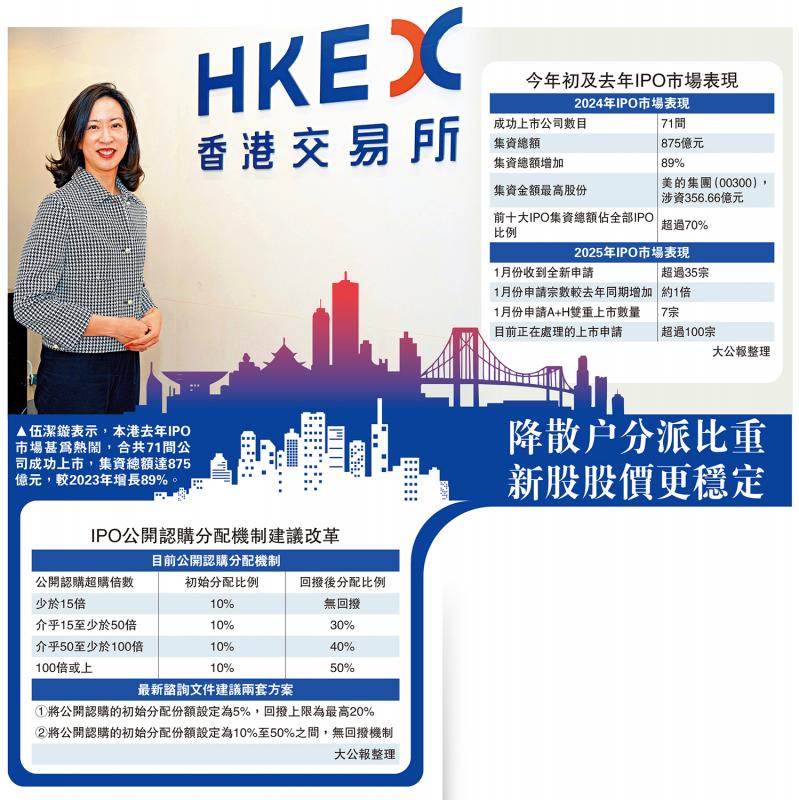 香港IPO市場在2024年下半年轉旺,有不少更獲超額認購,令到市場對抽新股的熱情重燃。踏入2025年後,IPO的申請更大幅增加,今年1月便已接受超過35宗新申請,較去年同期增加約1倍。港交所(00388)上市主管伍潔鏇表示,對IPO市場今年的表現感到樂觀。港交所將致力不斷審視及提升上市機制,確保能夠與時並進,增加香港資本市場的吸引力和競爭力。