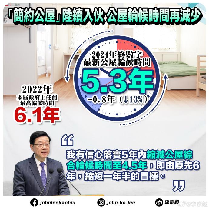 香港特區行政長官李家超在社交媒體表示,18日早他在行會前會見傳媒並公布公屋最新輪候時間:去年底公屋一般申請者平均輪候時間縮短至5.3年,是六年以來最低的年終數字,較本屆政府上任前的最高輪候時間6.1年縮短了九個半月。隨著三萬個“簡約公屋”的工程陸續開展,第一和第二期 “簡約公屋”今年開始陸續入伙,他有信心落實於五年內縮減公屋綜合輪候時間至四年半的目標,即由原先六年,縮短一年半的時間。