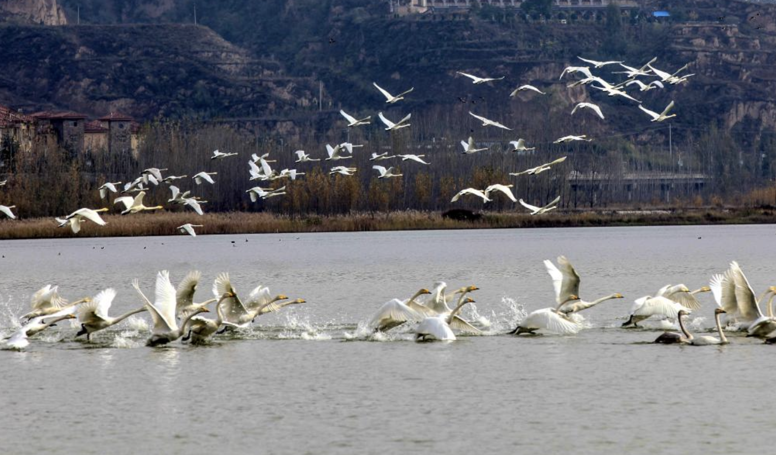 佔地6000多公頃的山西平陸黃河溼地位於山西、河南兩省交界處,這裡氣候溫和、採食豐富,非常適宜白天鵝越冬,是我國白天鵝三大越冬棲息地之一。每年10月底,白天鵝就會成群結隊地從俄羅斯西伯利亞地區陸續飛臨這裡越冬。近年來,隨着平陸黃河溼地生態環境不斷改善,每年到此越冬的白天鵝數量都在1萬只以上。