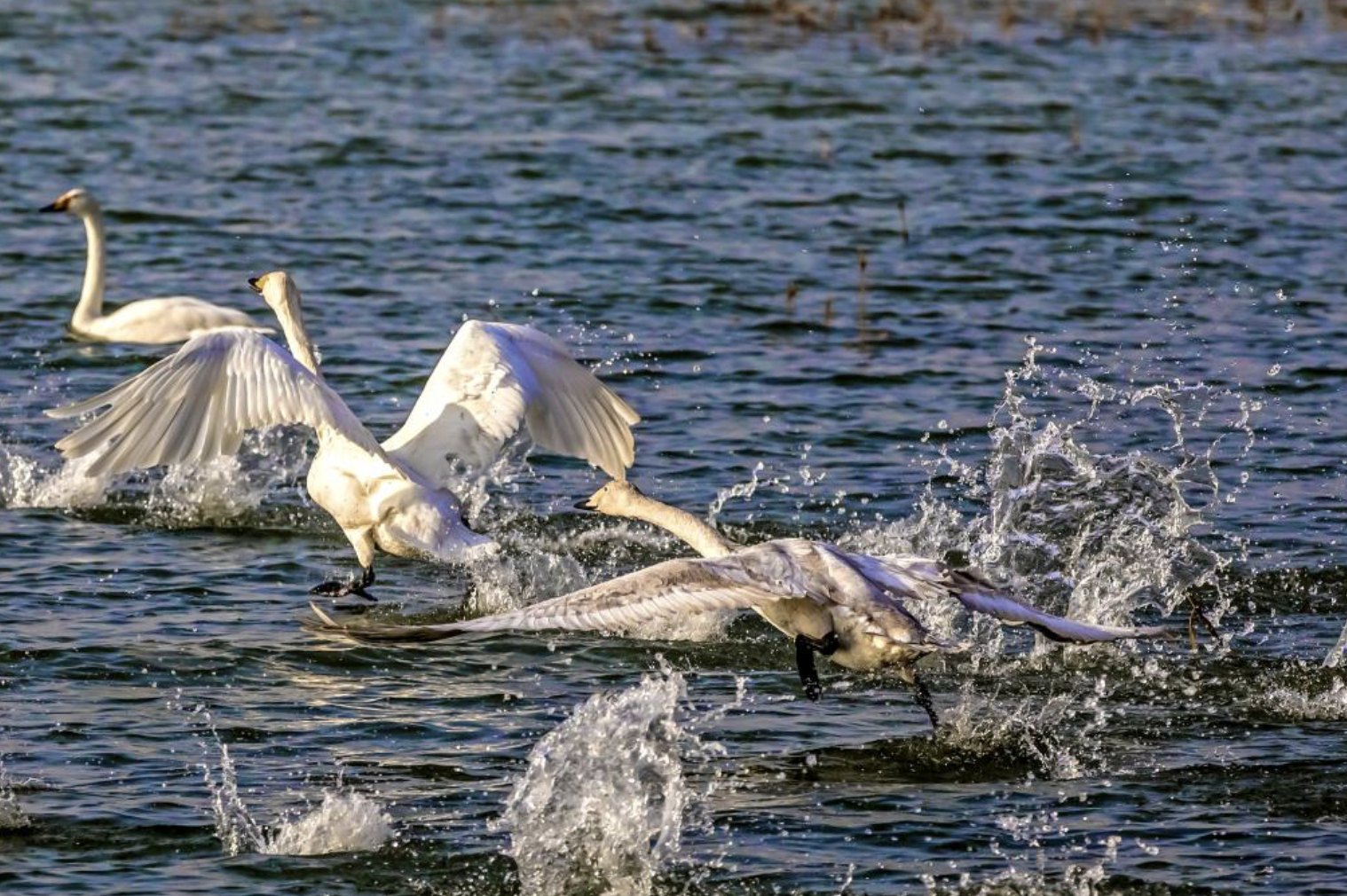 黃河水暖“鵝”先知。在山西平陸黃河溼地,成群結隊的白天鵝在河面上練習起飛、降落、滑行,為“返鄉”熱身。它們時而引吭高歌,時而嬉戲打鬧,潔白的身影與波光粼粼的水面相映成趣,構成了一幅和諧美麗的生態畫卷。