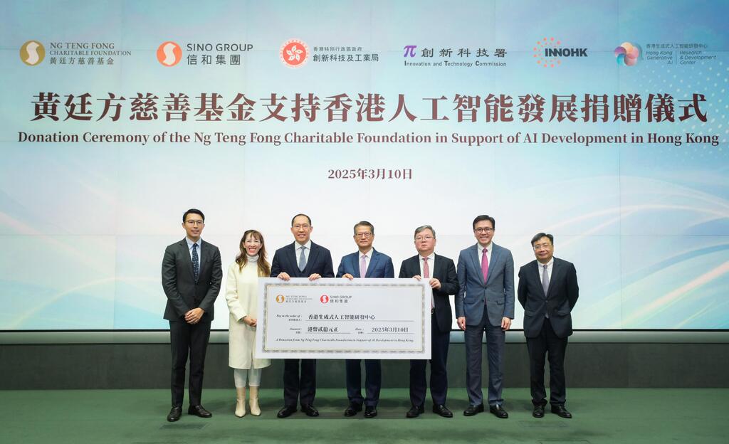 香港特區財政司司長陳茂波10日出席黃廷方慈善基金與信和集團支持香港人工智能發展的捐贈儀式,見證黃廷方慈善基金與信和集團捐贈港幣二億元予InnoHK創新香港研發平台(InnoHK)旗下的香港生成式人工智能研發中心,支持該中心建立服務平台為香港市民提供基於港產大模型HKGAI V1的“港話通”對話服務。在儀式上,黃廷方慈善基金董事暨信和集團副主席黃永光向香港科技大學首席副校長兼InnoHK香港生成式人工智能研發中心主任郭毅可教授轉交支票。創新科技及工業局局長孫東教授及創新科技署署長李國彬出席並見證捐贈儀式。