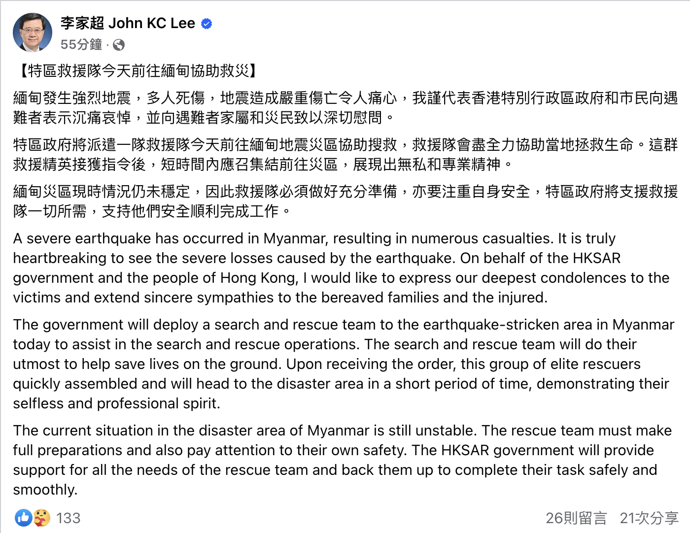 李家超表示,緬甸發生強烈地震,多人死傷,地震造成嚴重傷亡令人痛心,他謹代表香港特別行政區政府和市民向遇難者表示沉痛哀悼,並向遇難者家屬和災區民衆致以深切慰問。