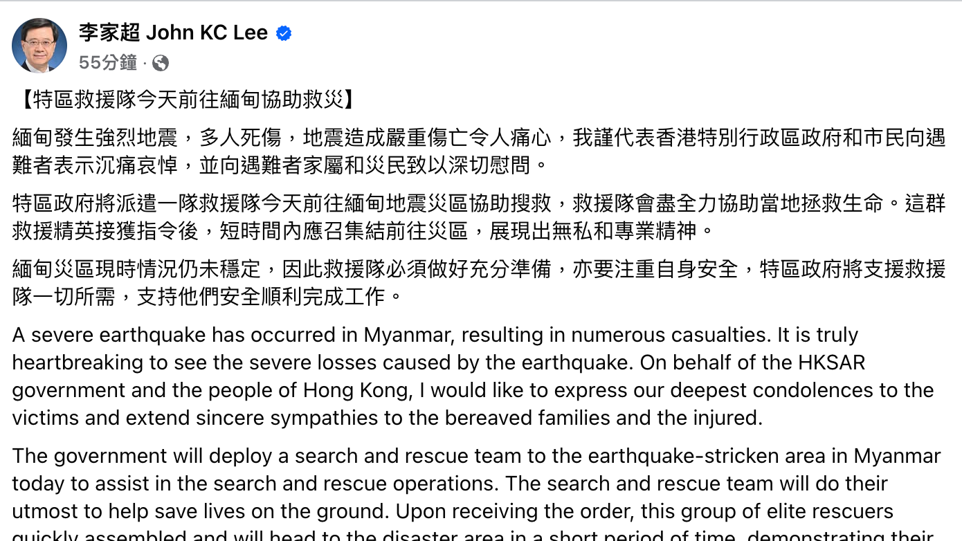 3月28日14時20分,緬甸發生7.9級地震,造成了緬甸多地重大人員傷亡及財產損失。香港特區行政長官李家超今日(29日)發布社交媒體表示,特區政府將派遣一隊救援隊前往緬甸地震災區協助搜救。