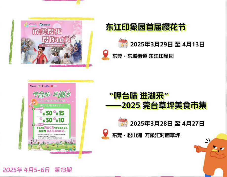 3月29日至4月13日,在東江印象園舉行首屆櫻花節,在一片夢幻的“粉色海洋”中與“哪吒”、“敖丙”驚喜偶遇,享歡樂劇場、拍國風大片,度過歡樂週末。