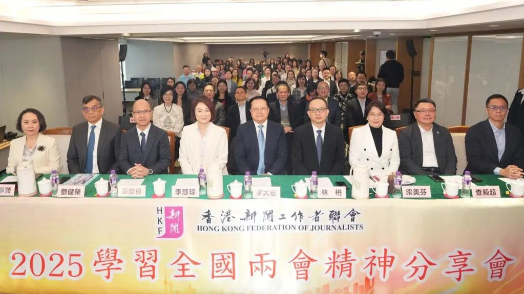 4月8日,香港新聞工作者聯會(新聞聯)舉行“2025學習全國兩會精神分享會”,邀請全國人大常委會委員李慧琼,港區全國人大代表梁美芬、林順潮、冼漢迪和黃錦良,全國政協委員鄧健榮、查毅超和盧永雄,以及新聞聯主席、全國政協委員李大宏和新聞聯常務理事、全國政協委員曾瀞漪一同出席會議,深入學習全國兩會的重要精神,探討香港在中國式現代化建設的角色與機遇。中央政府駐港聯絡辦宣文部副部長林枬應邀出席。