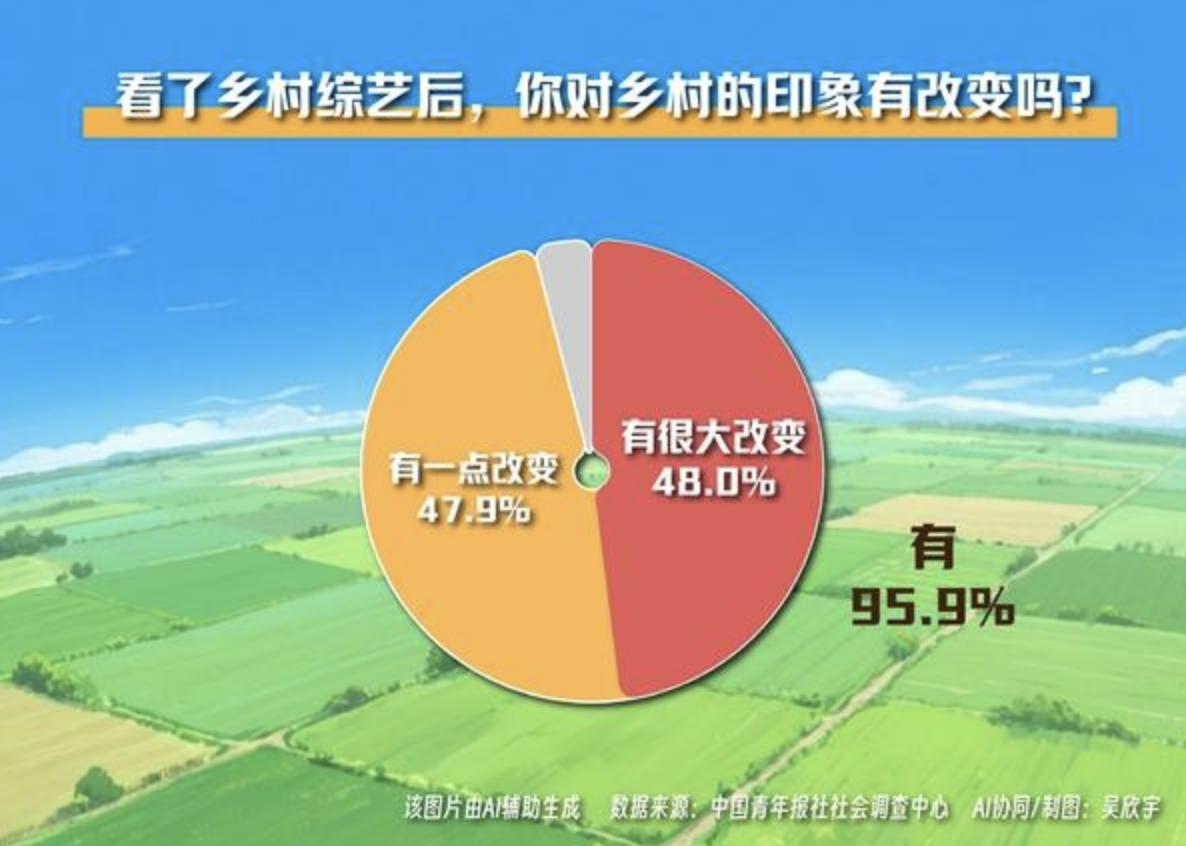 調查顯示,95.9%的受訪青年表示看了鄉村綜藝後,對鄉村的印象有所改變。其中近五成(48.0%)受訪青年覺得有很大改變。