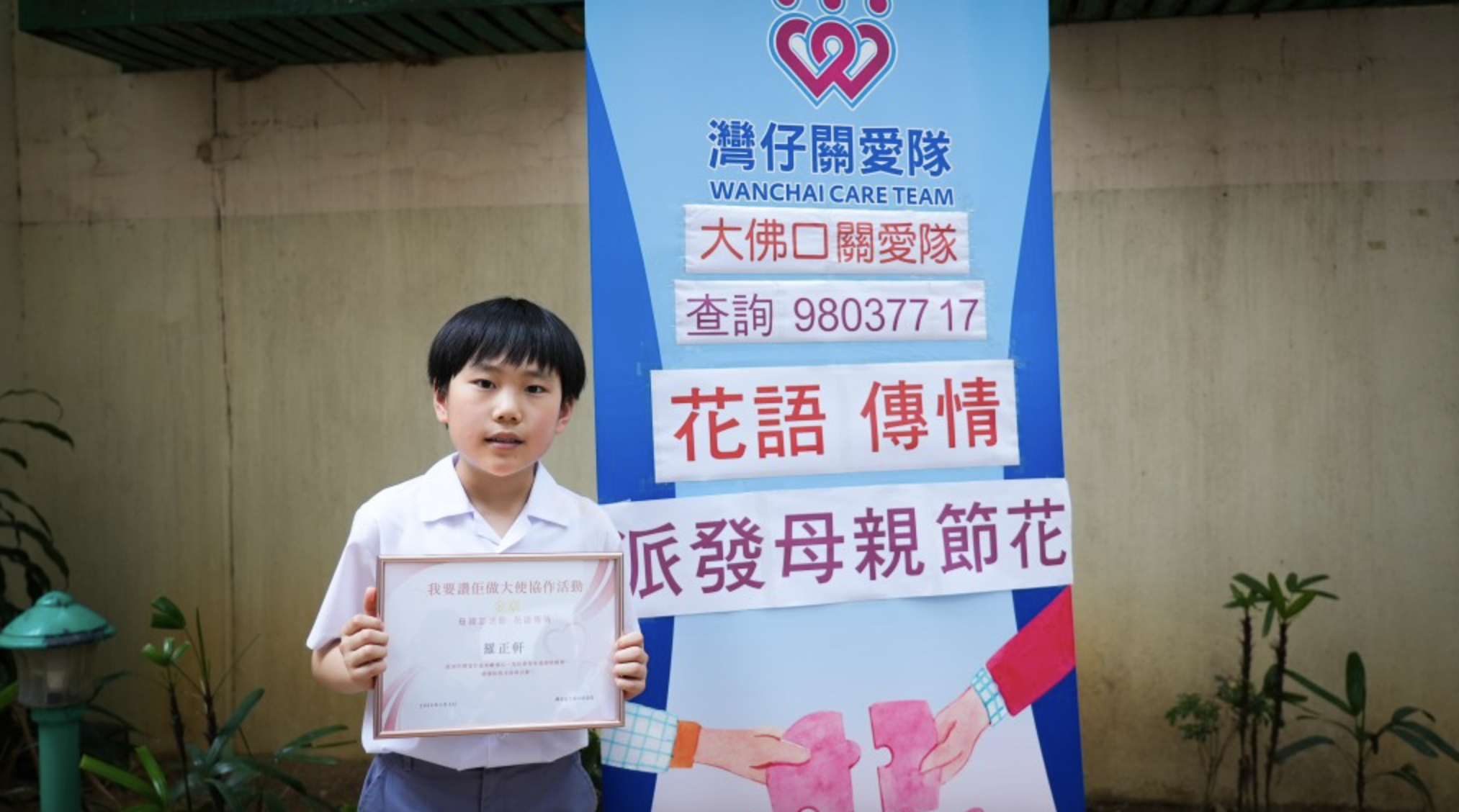 年僅十歲、就讀小學五年級的林啟澤,是今次活動的“我要讚佢”學生大使之一。林同學對關愛隊的服務範疇有不少認知,他瞭解關愛隊平日積極走訪長者、孤兒、劏房戶及低收入家庭,提供慰問及關愛物資。這次派花活動讓他深刻體會母愛的偉大,以及母親們平日的辛勞付出,活動亦使他主動與陌生人互動,並獻上溫馨的母親節祝福。未來,他期許能參與更多關愛隊的義工服務,回饋社會。